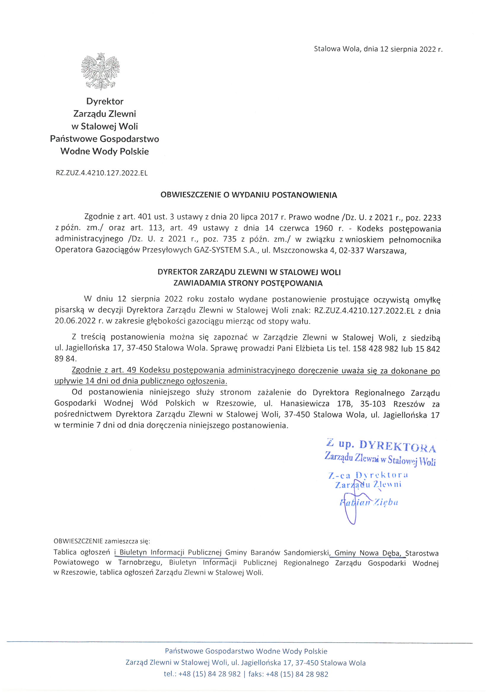 Obwieszczenie Dyrektora Zarządu Zlewni w Stalowej Woli Państwowego Gospodarstwa Wodnego Wody Polskie