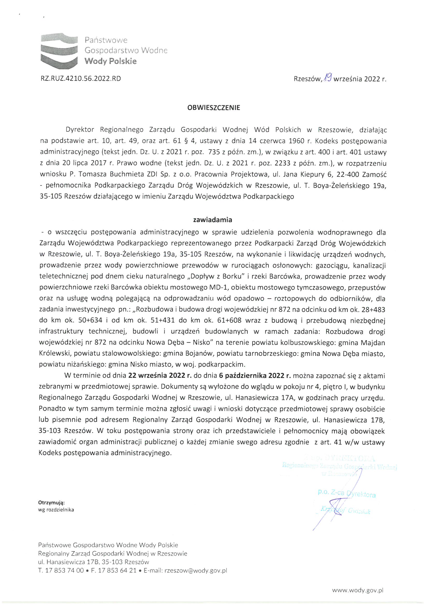 Zawiadomienie Dyrektora Regionalnego Zarządu Gospodarki Wodnej Wód Polskich w Rzeszowie