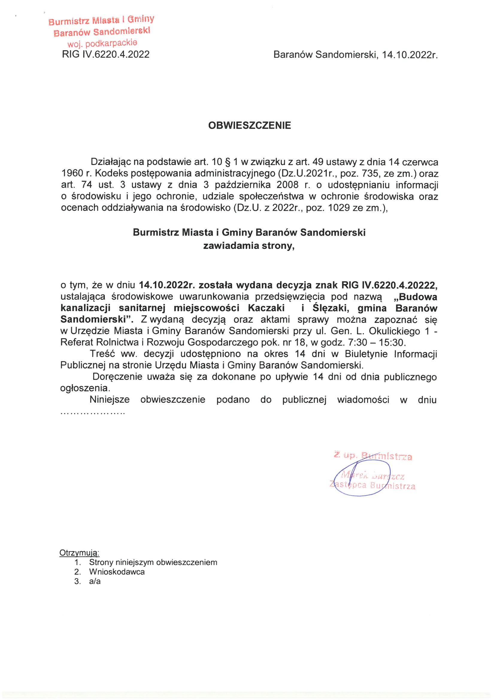 Obwieszczenie Burmistrza Miasta i Gminy Baranów Sandomierski