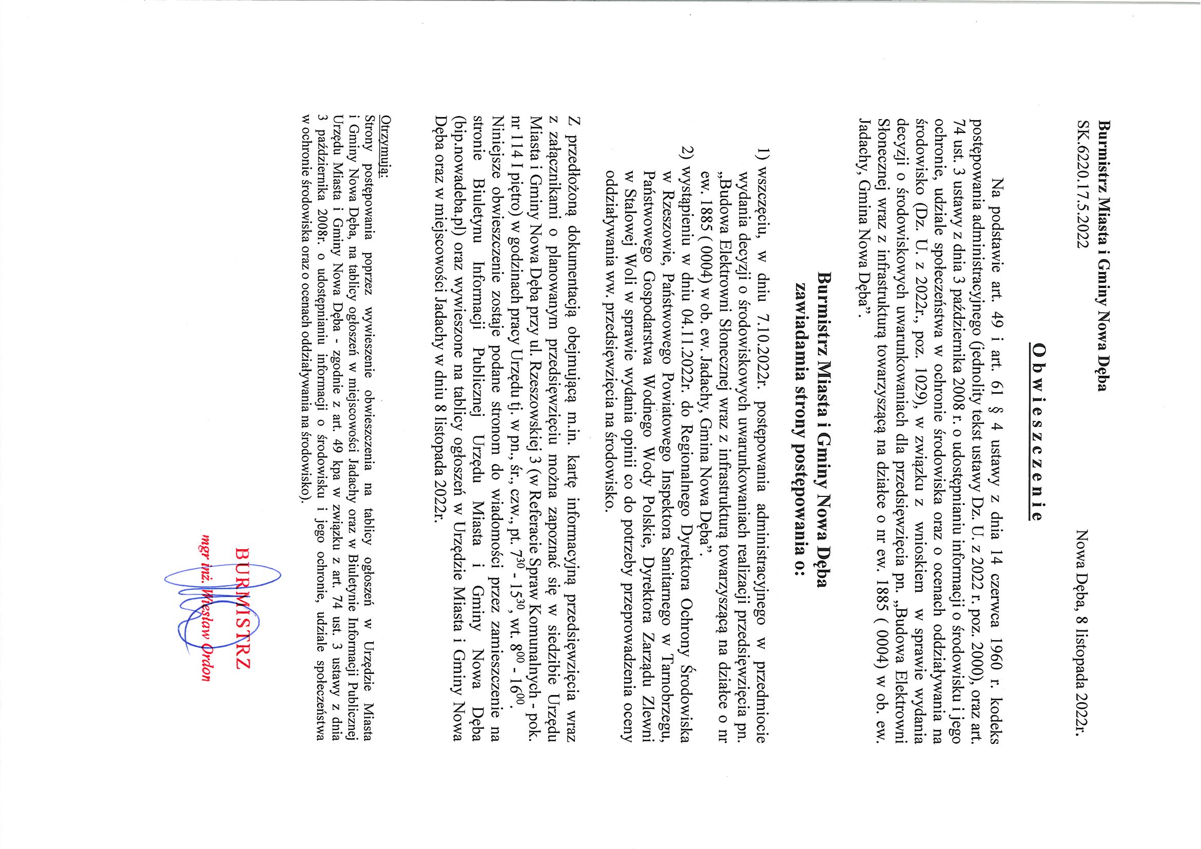 Obwieszczenie z dnia 08.11.2022 r. Burmistrza Miasta i Gminy Nowa Dęba znak SK.6220.17.5.2022
