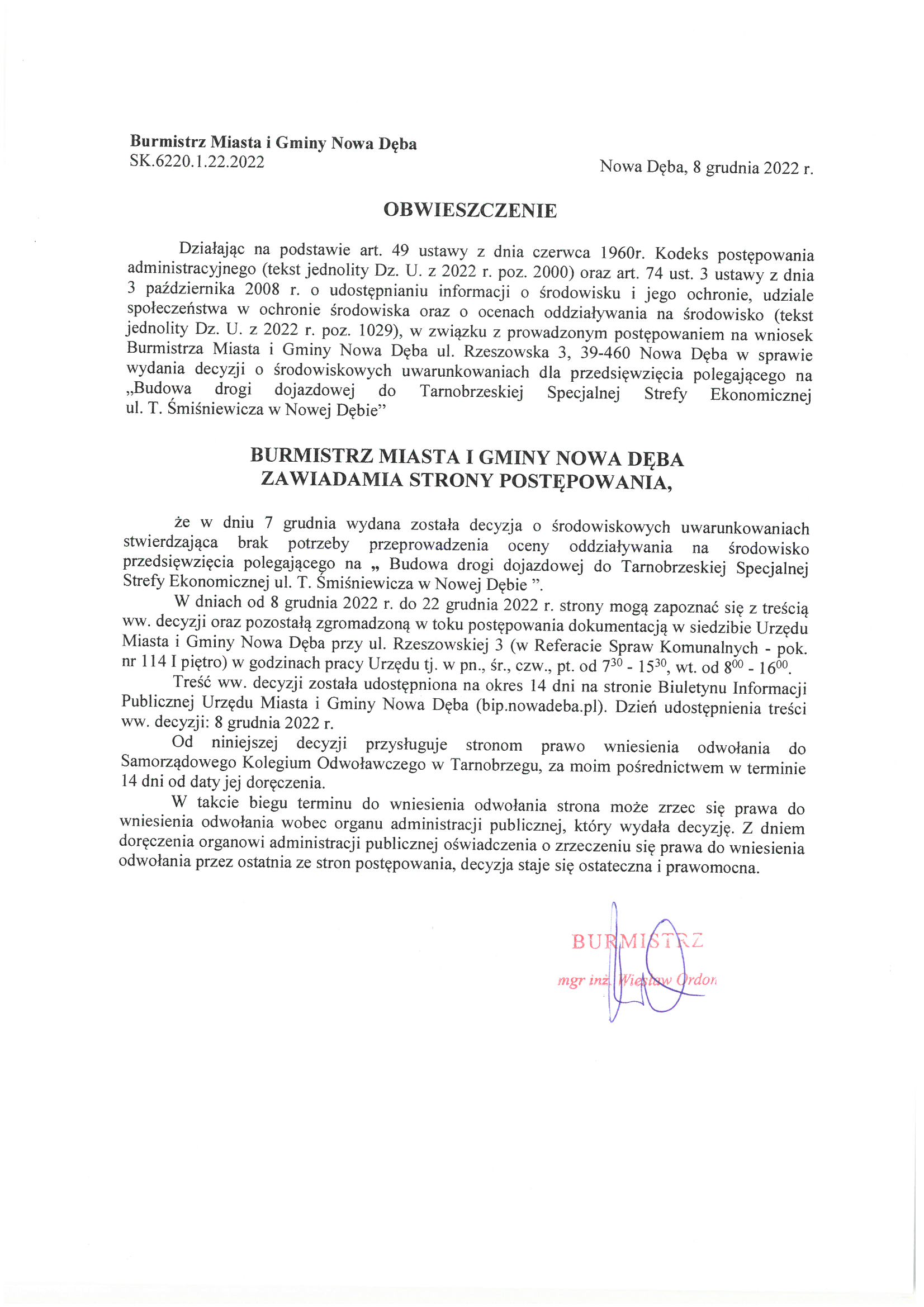 Obwieszczenie Burmistrza Miasta i Gminy Nowa Dęba znak:SK.6220.1.22.2022
