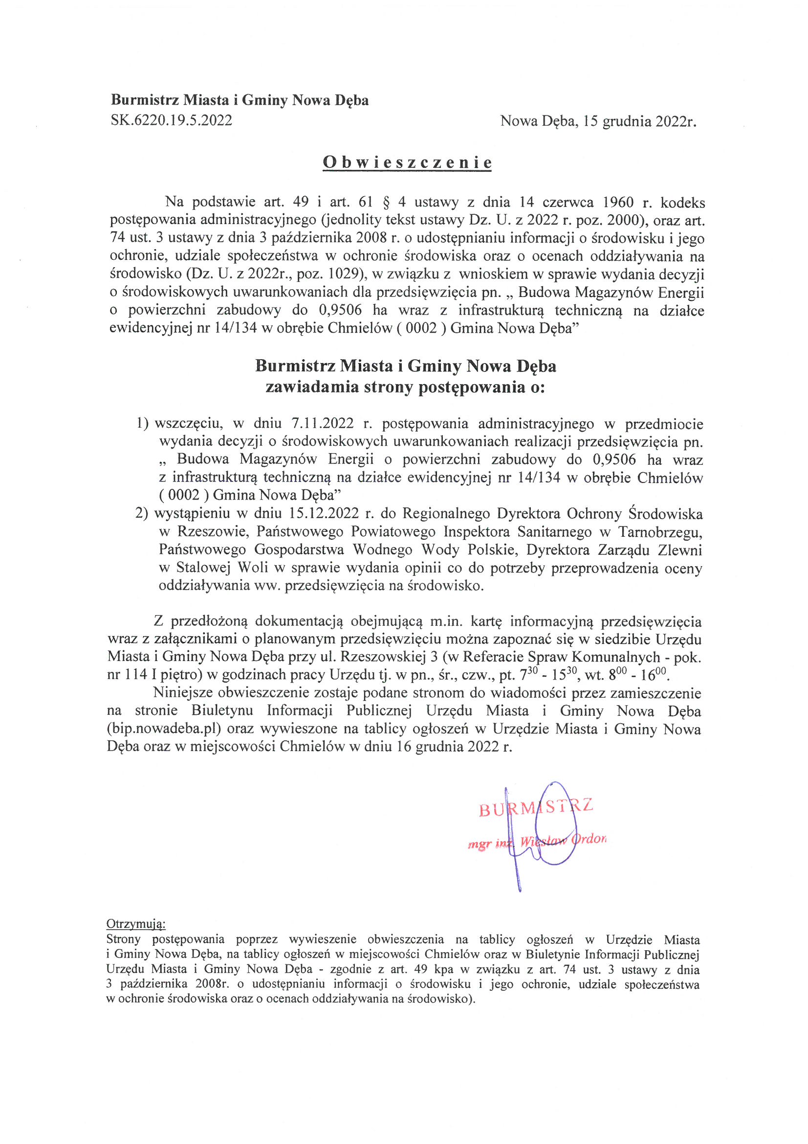 Obwieszczenie Burmistrza Miasta i Gminy Nowa Dęba z dnia 16 grudnia 2022 r. znak:SK.6220.19.5.2022