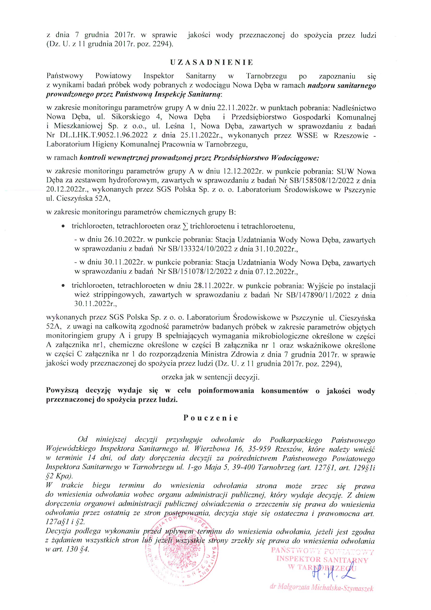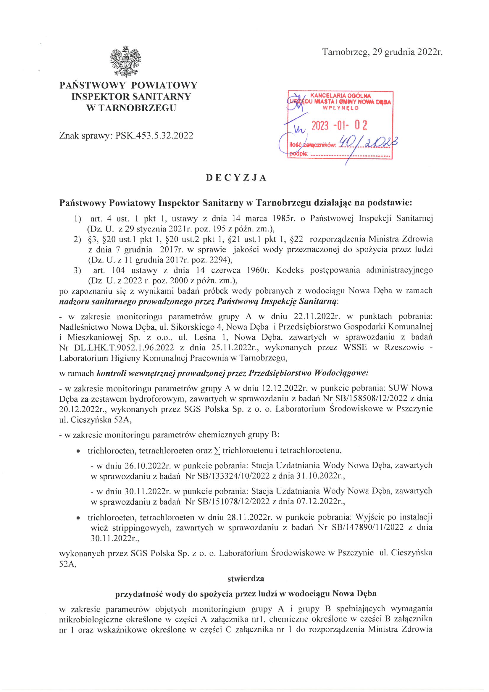 Decyzja o przydatności wody do spożycia
