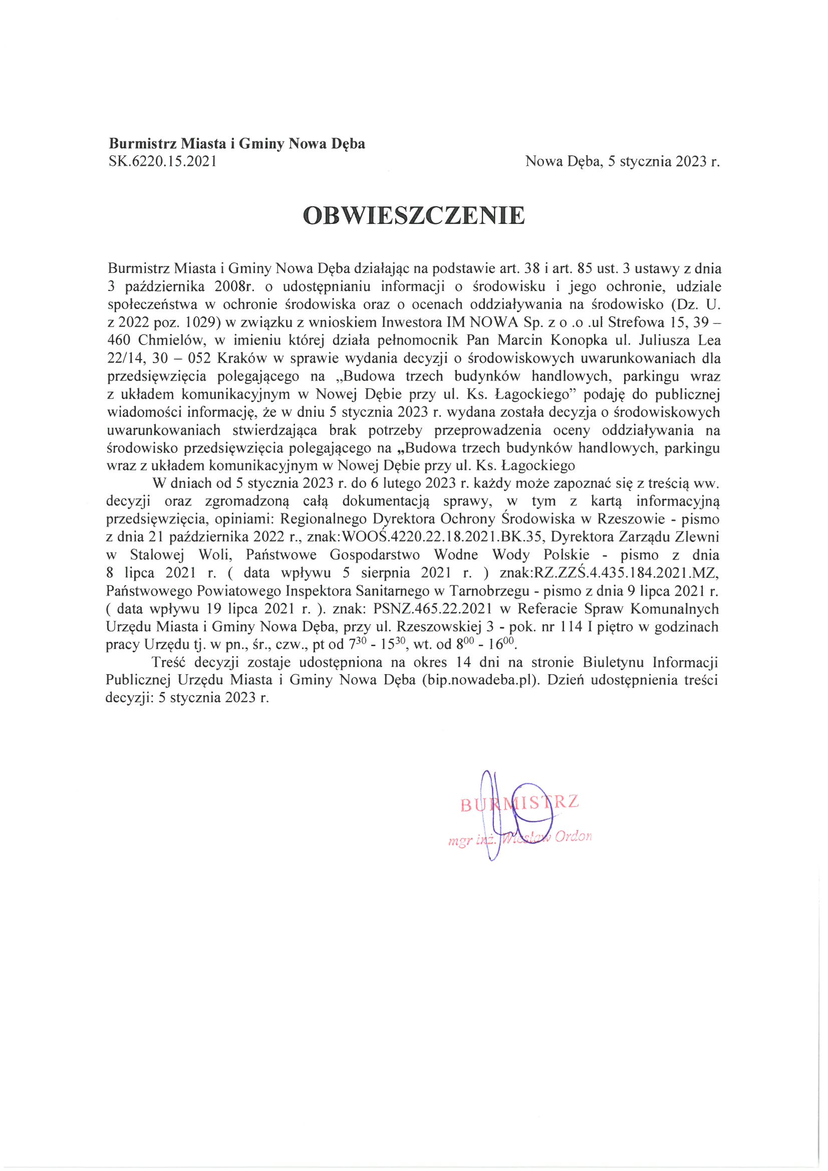 Obwieszczenie Burmistrza Miasta i Gminy Nowa Dęba w sprawie wyd. decyzji o środowiskowych uwarunkowaniach znak:SK.6220.15.2021