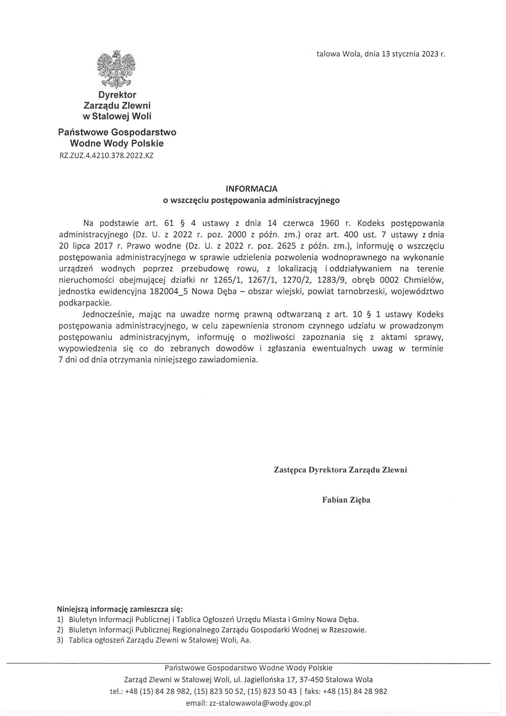 Dyrektor Zarządu Zlewni w Stalowej Woli Państwowego Gospodarstwa Wodnego Wody Polskie informuje