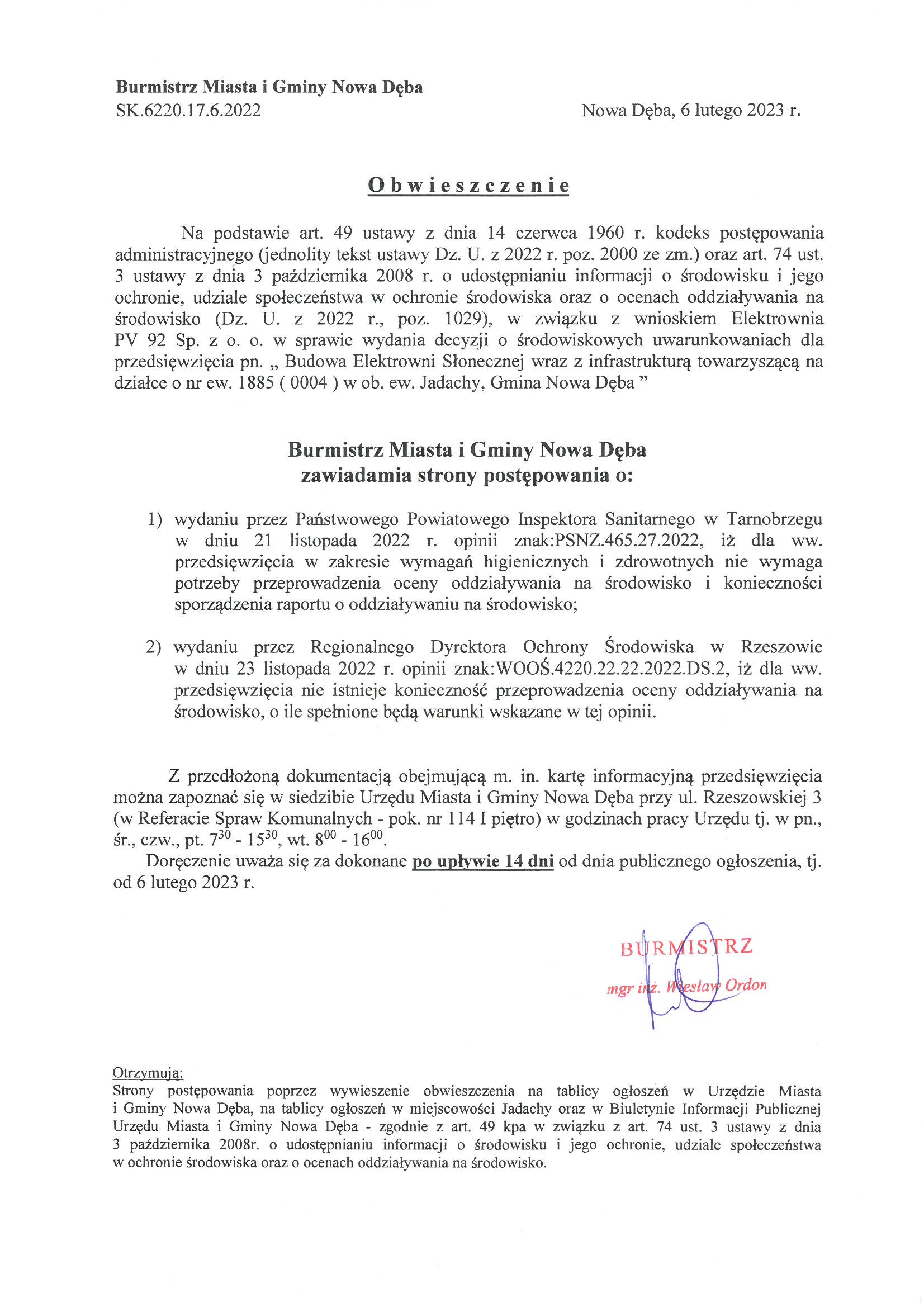 Obwieszczenie Burmistrza Miasta i Gminy Nowa Dęba z dnia 06.02.2023 r., znak:SK.6220.17.6.2022