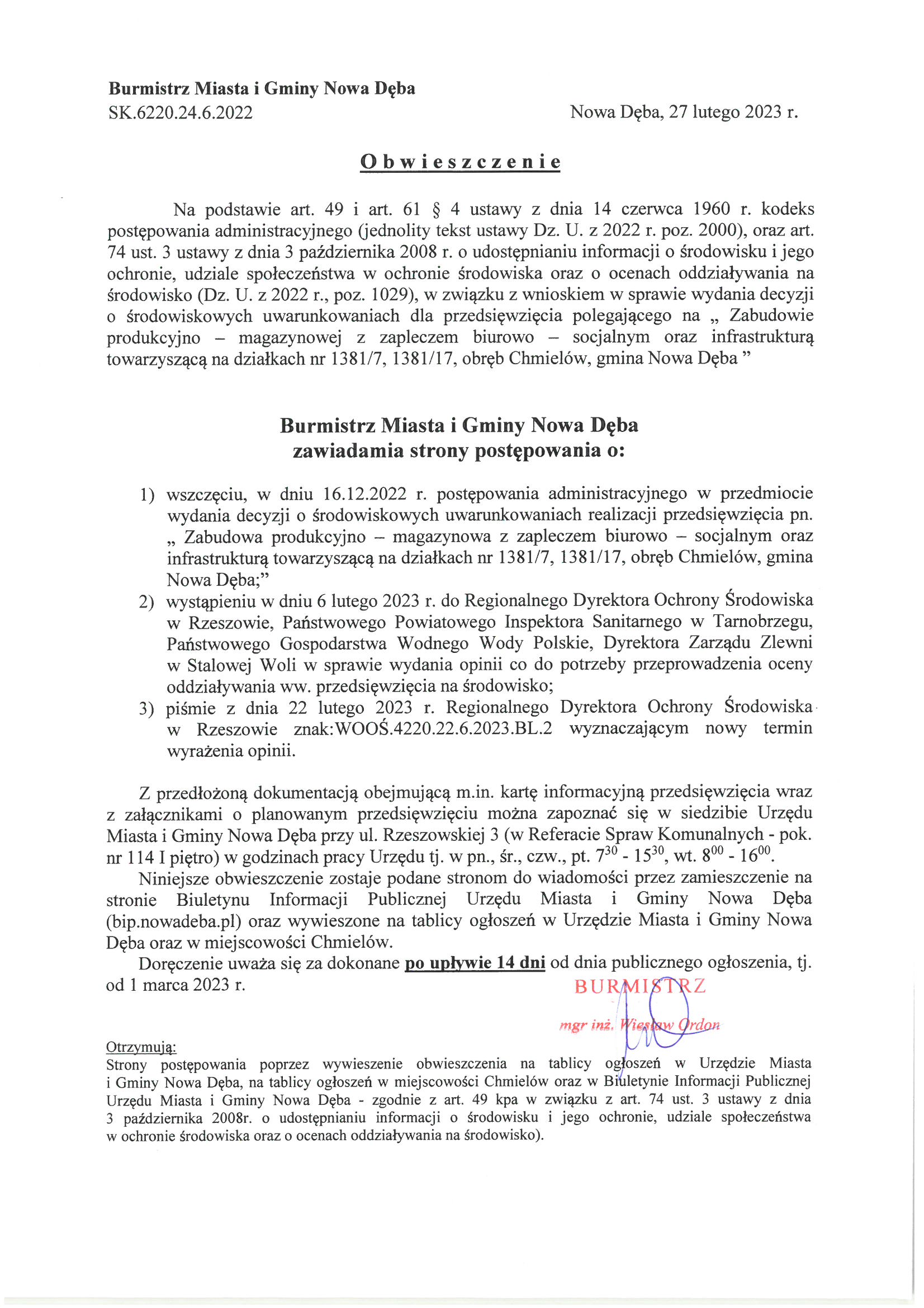 Obwieszczenie Burmistrza Miasta i Gminy Nowa Dęba znak:SK.6220.24.6.2022