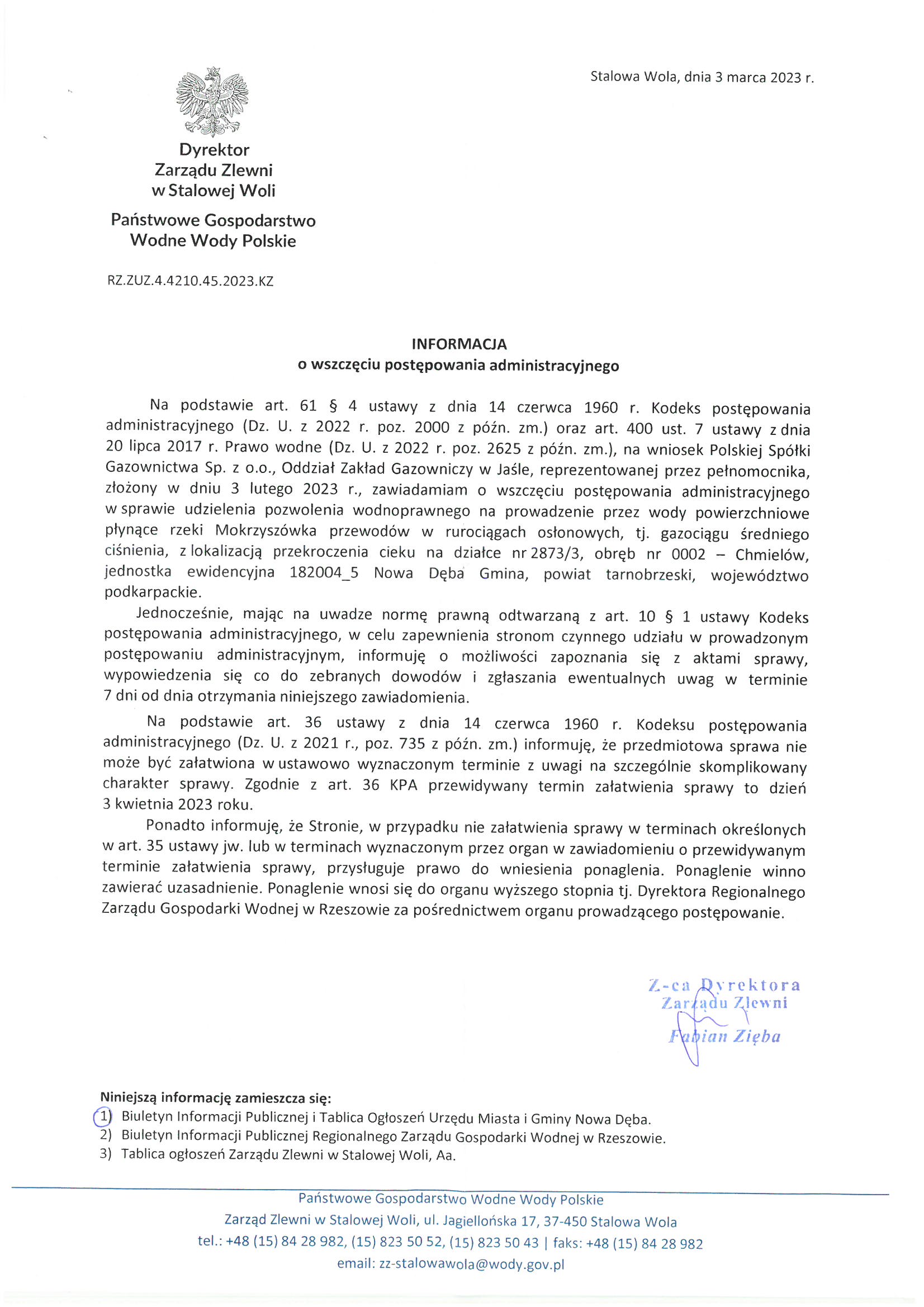 Informacja Dyrektora Zarządu Zlewni w Stalowej Woli o wszczęciu postępowania administarcyjnego znak: RZ.ZUZ.4.4210.45.2023.KZ