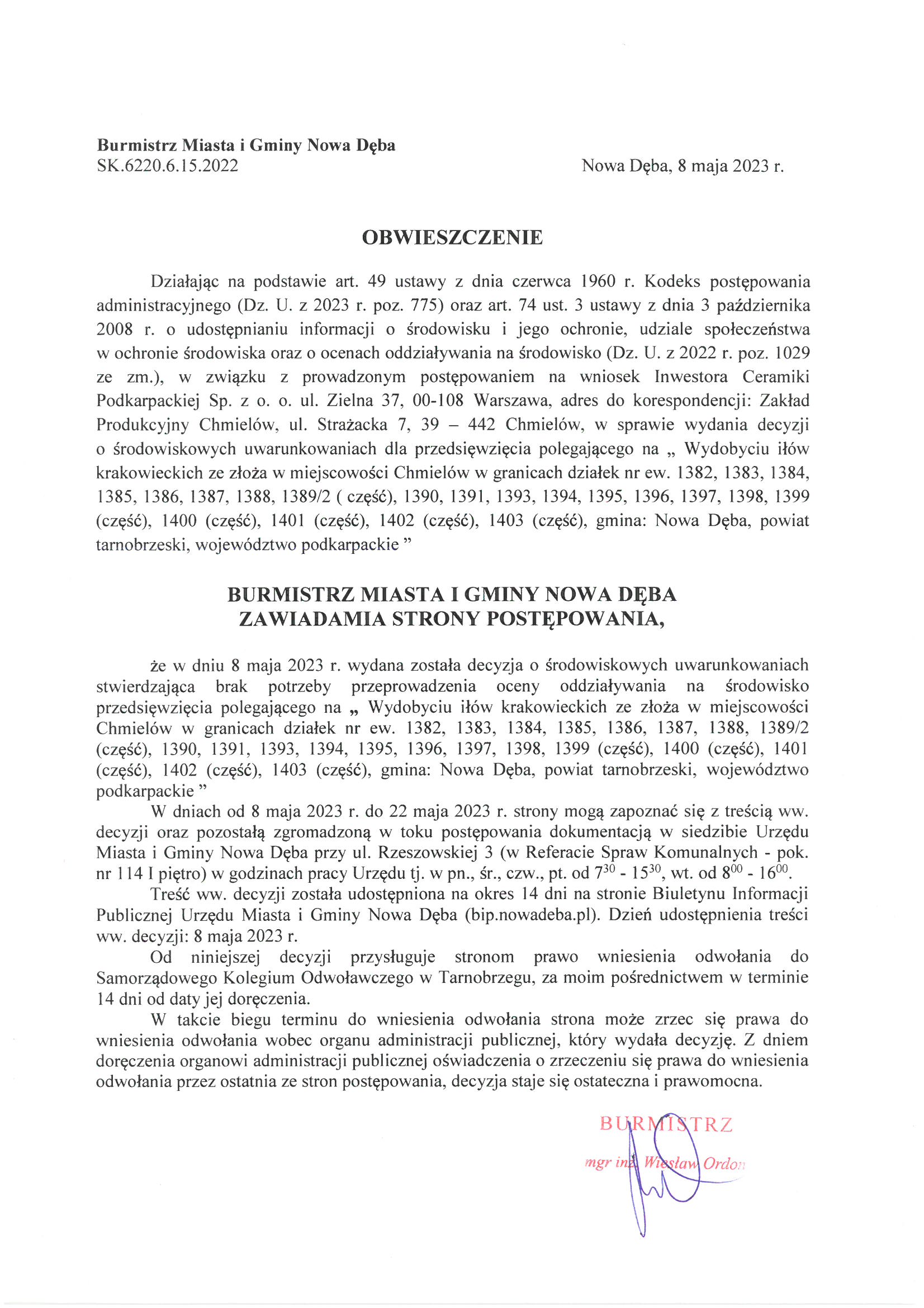 Obwieszczenia Burmistrza Miasta i Gminy Nowa Dęba z dnia 8 maja 2023 r.SK.6220.6.15.2022