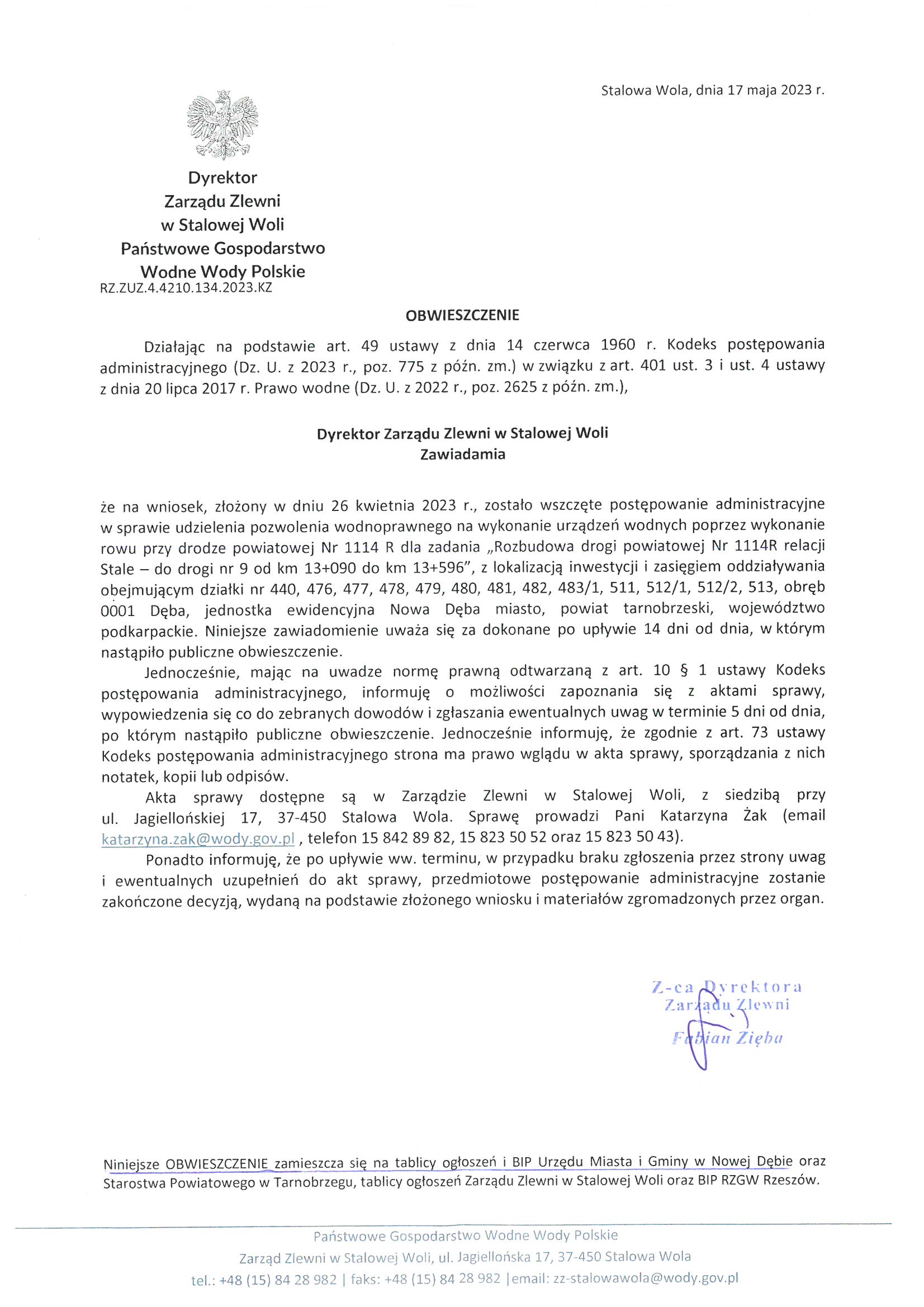 Obwieszczenie Dyrektora Zarządu Zlewni w Stalowej Woli
