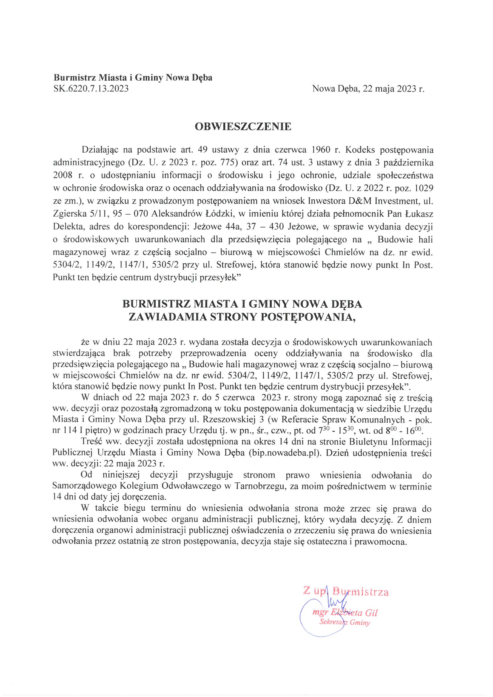 Obwieszczenie Burmistrza Miasta i Gminy Nowa Dęba z dnia 22 maja 2023 r. znak:SK.6220.7.13.2023
