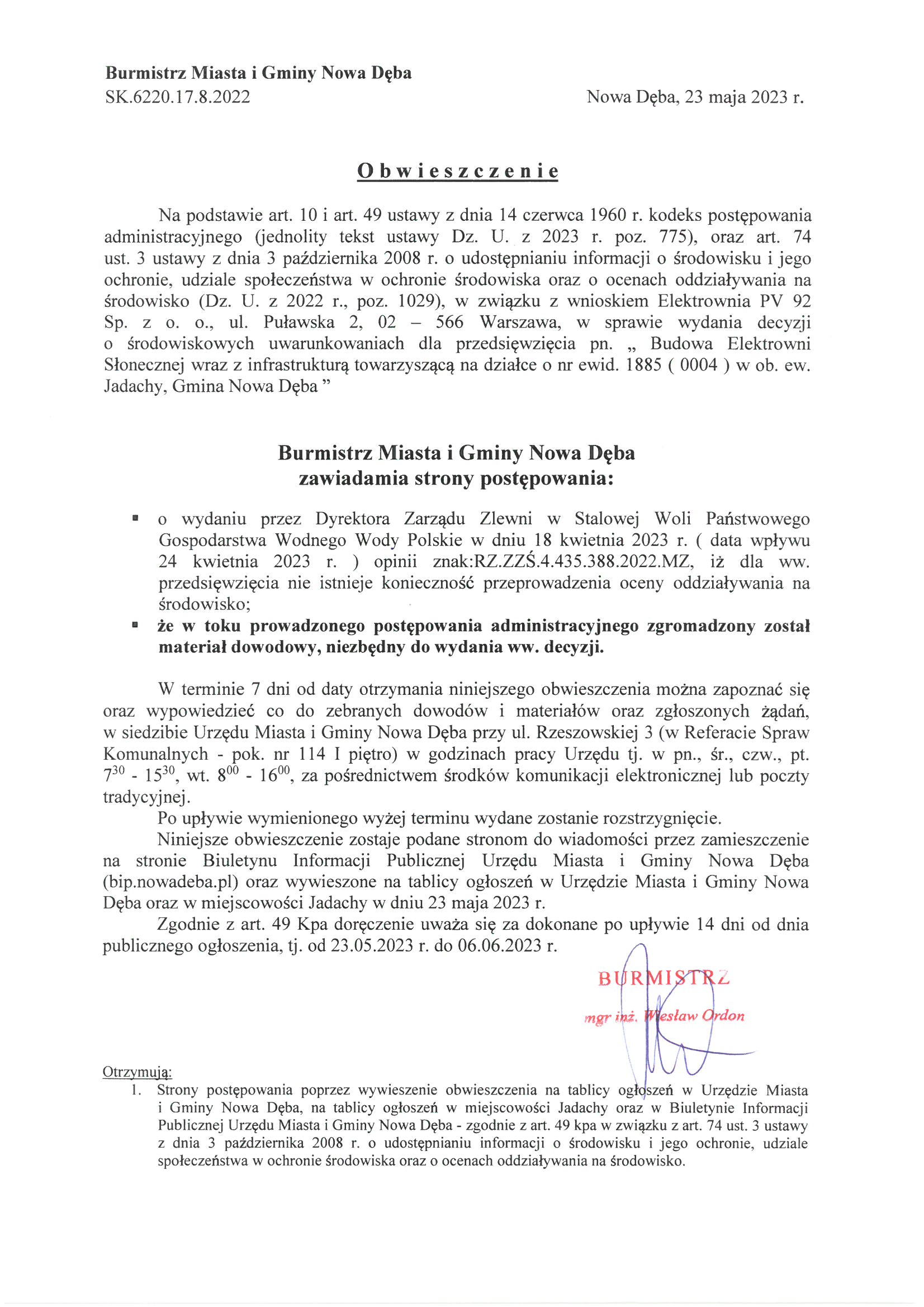 Obwieszczenie Burmistrza Miasta i Gminy Nowa Dęba znak:SK.6220.17.8.2022 z dnia 23 maja 2023 r.