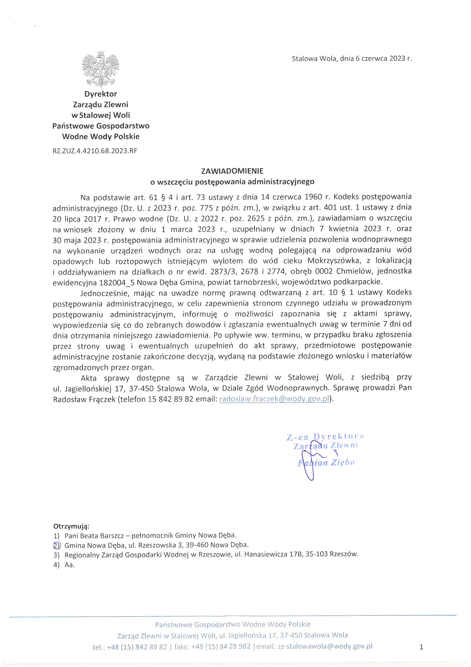 Zawiadomienie Dyrektora Zarządu Zlewni w Stalowej Woli o wszczęciu postępowania administracyjnego