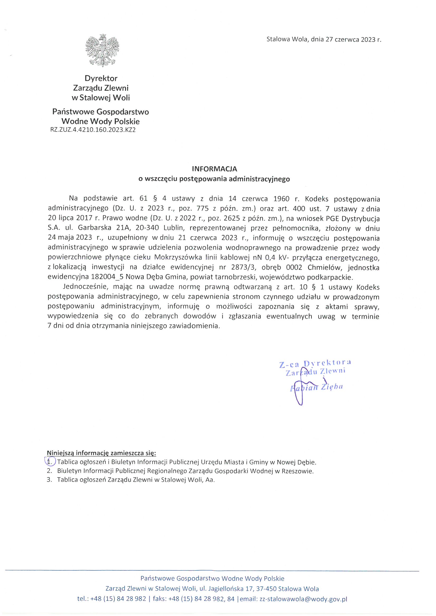 Informacja Dyrektora Zarządu Zlewni w Stalowej Woli o wszczęciu postępowania administarcyjnego