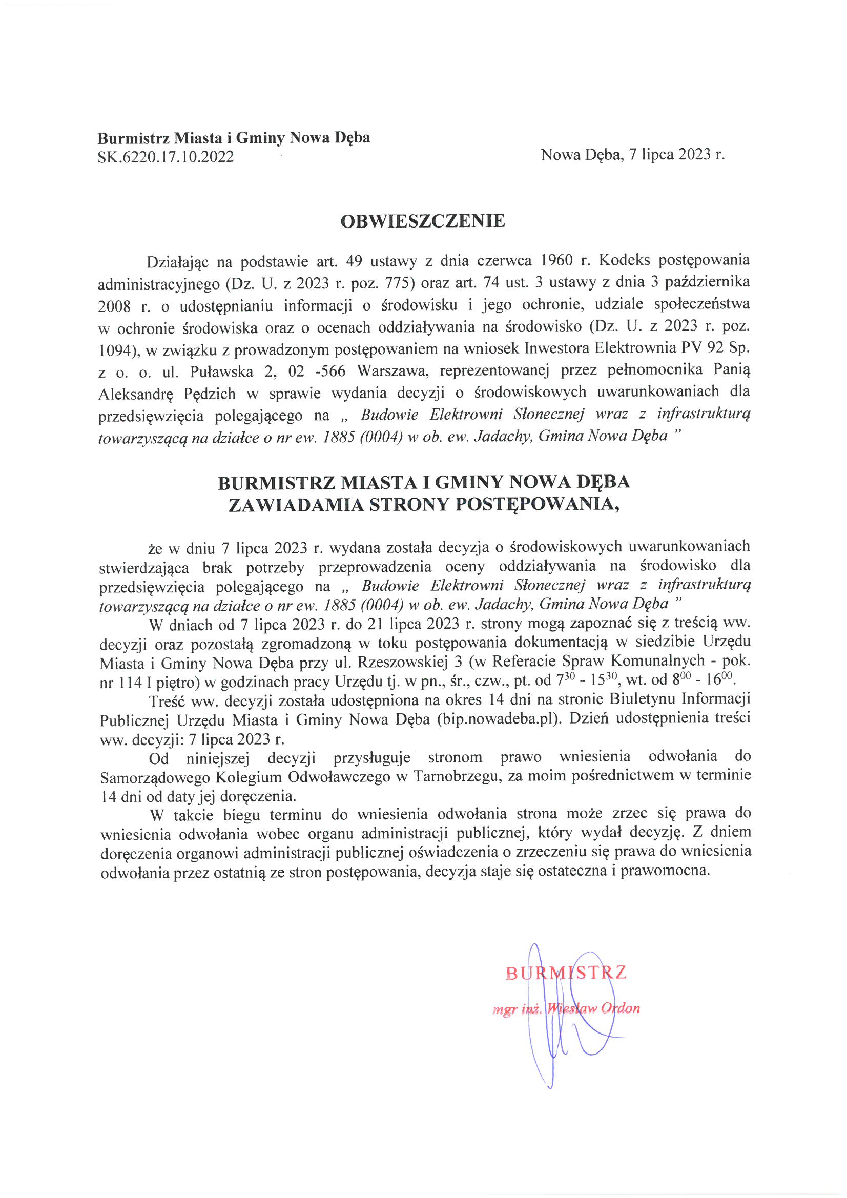 Obwieszczenie Burmistrza Miasta i Gminy Nowa Dęba z dnia 7 lipca 2023 r. znak:SK.6220.17.10.2022