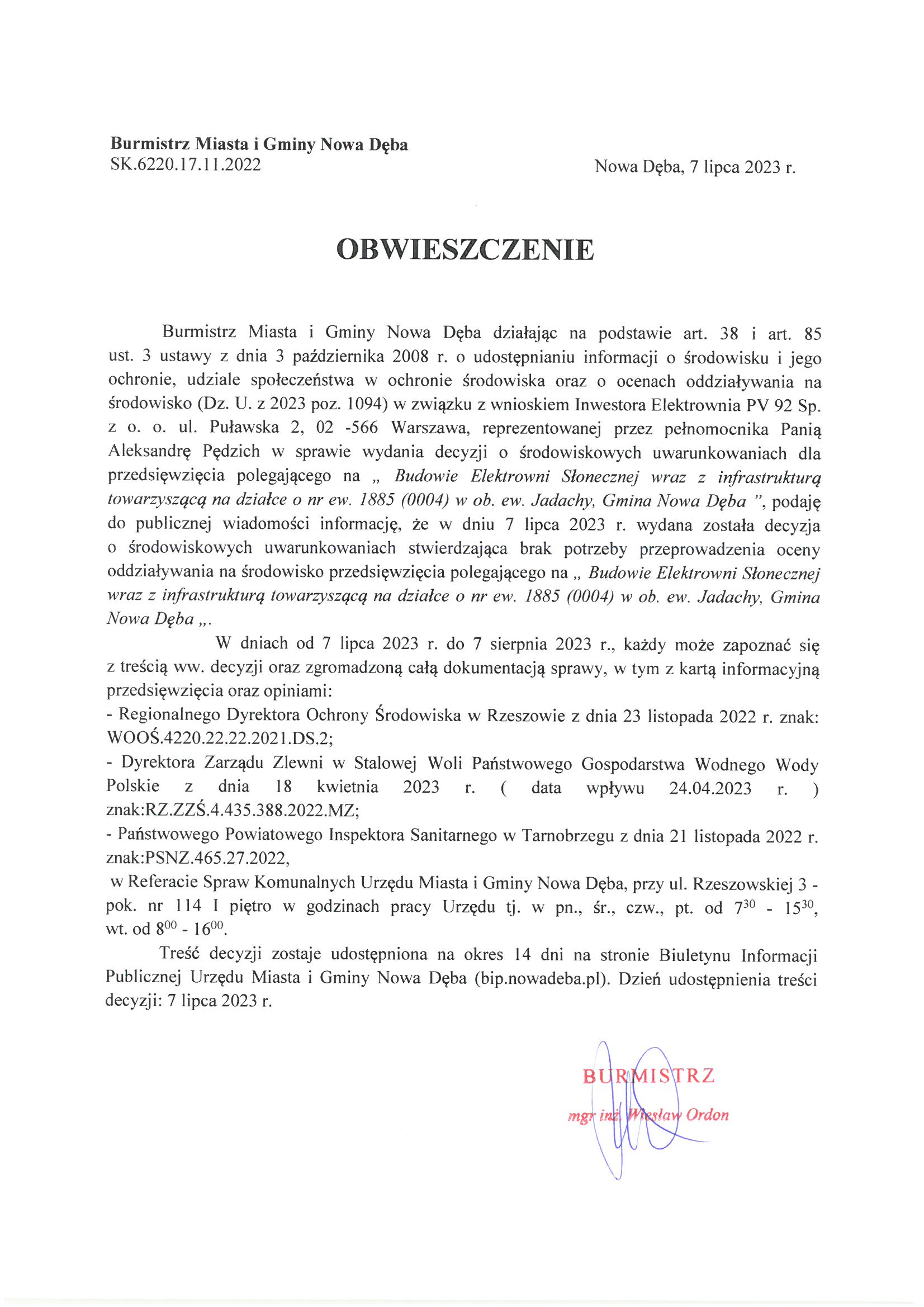 Obwieszczenie Burmistrza Miasta i Gminy Nowa Dęba z dnia 7 lipca 2023 r. znak:SK.6220.17.11.2022