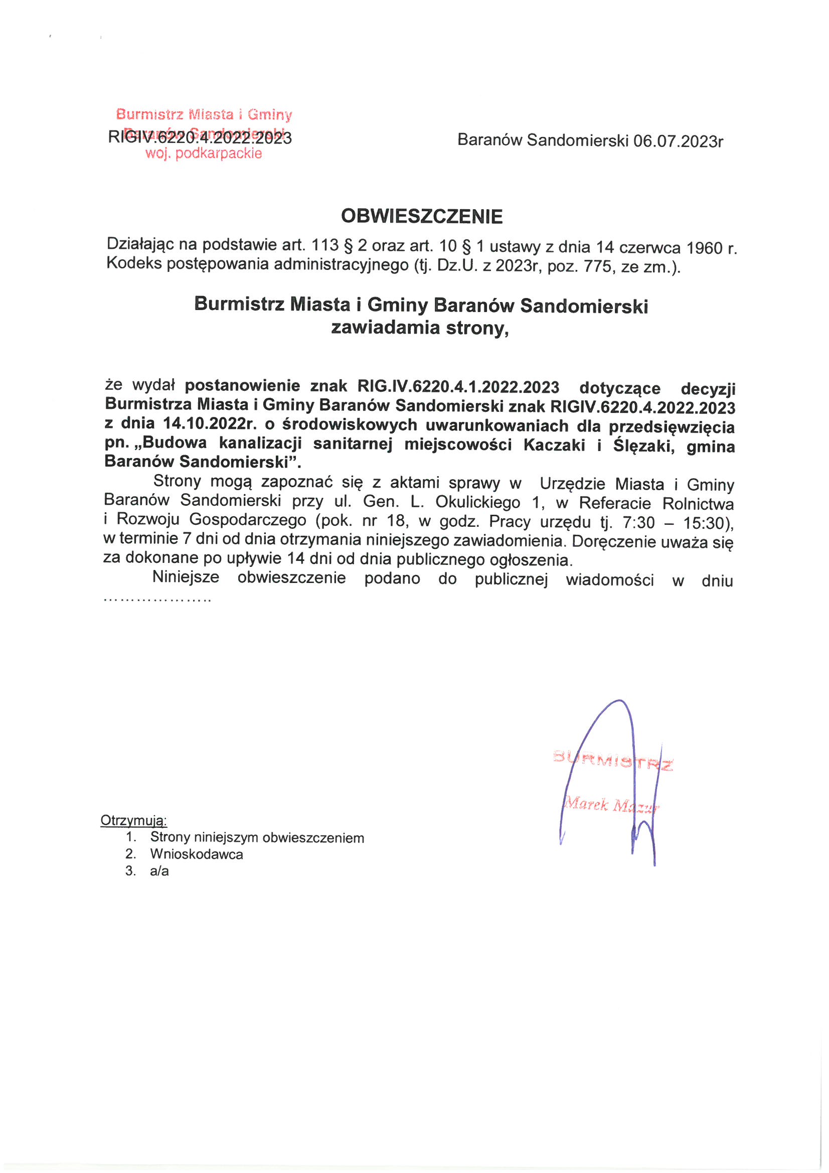 Obwieszczenie Burmistrza Miasta i Gminy Baranów Sandomierski z dnia 06.07.2023 r. RIGIV.4.2022.2023