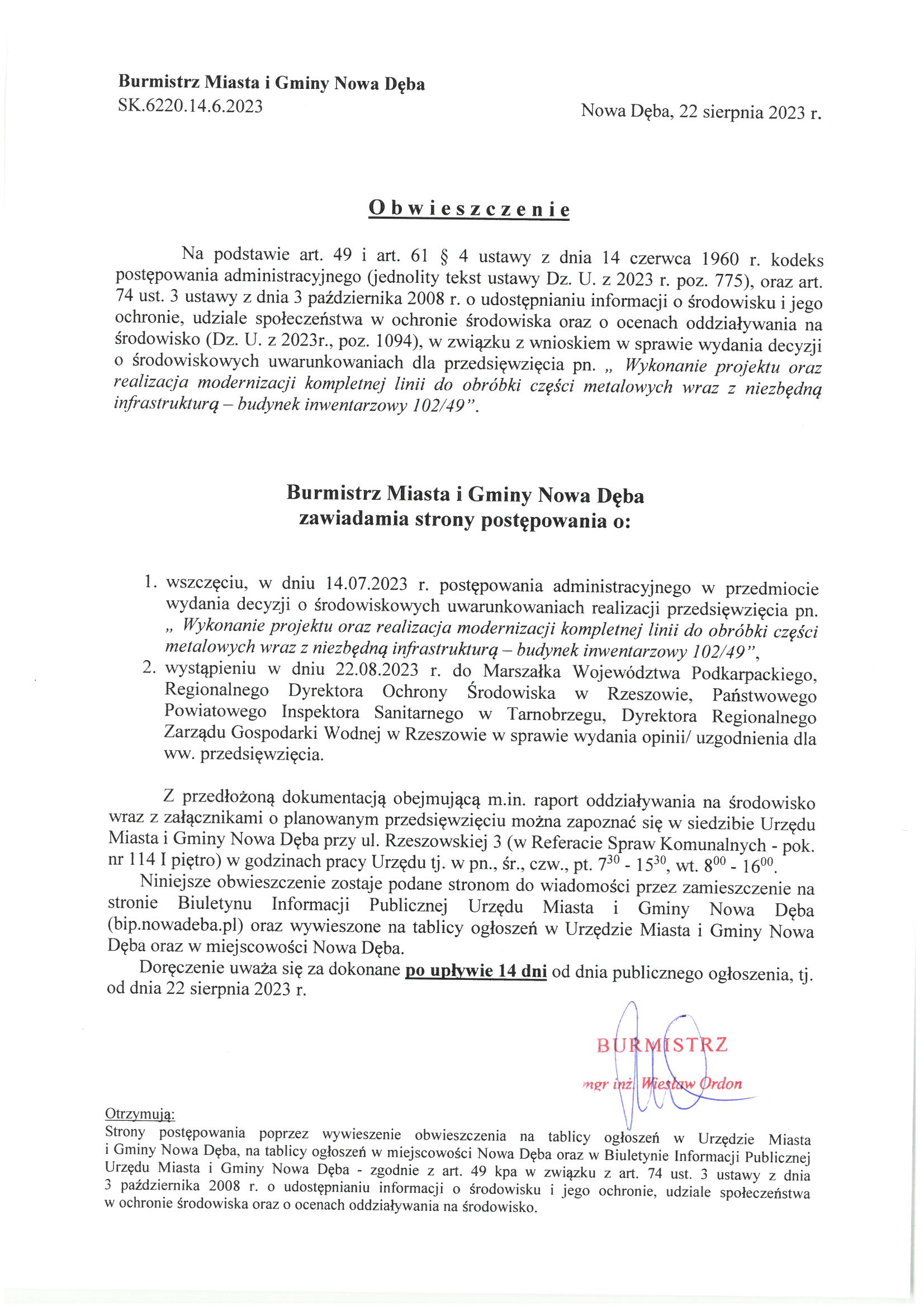 Obwieszczenie Burmistrza Miasta i Gminy Nowa Dęba z dnia 22 sierpnia 2023 r. znak:SK.6220.14.6.2023
