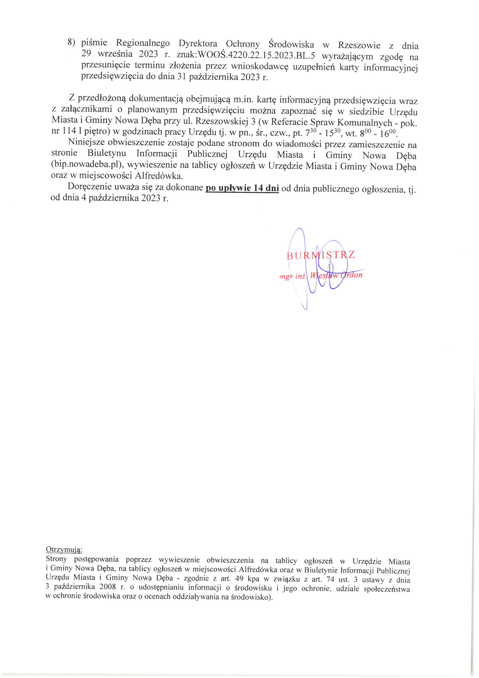 Obwieszczenie Burmistrza Miasta i Gminy Nowa Dęba z dnia 4 października2023 r. znak:SK.6220.11.2023