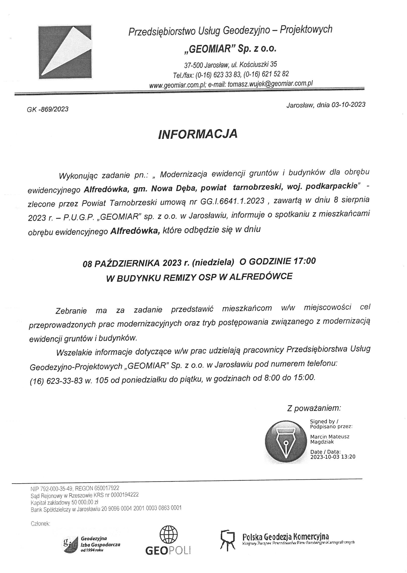Informacja o spotkaniu w sprawie: Modernizacji ewidencji gruntów i budynków w miejscowości Alfredówka