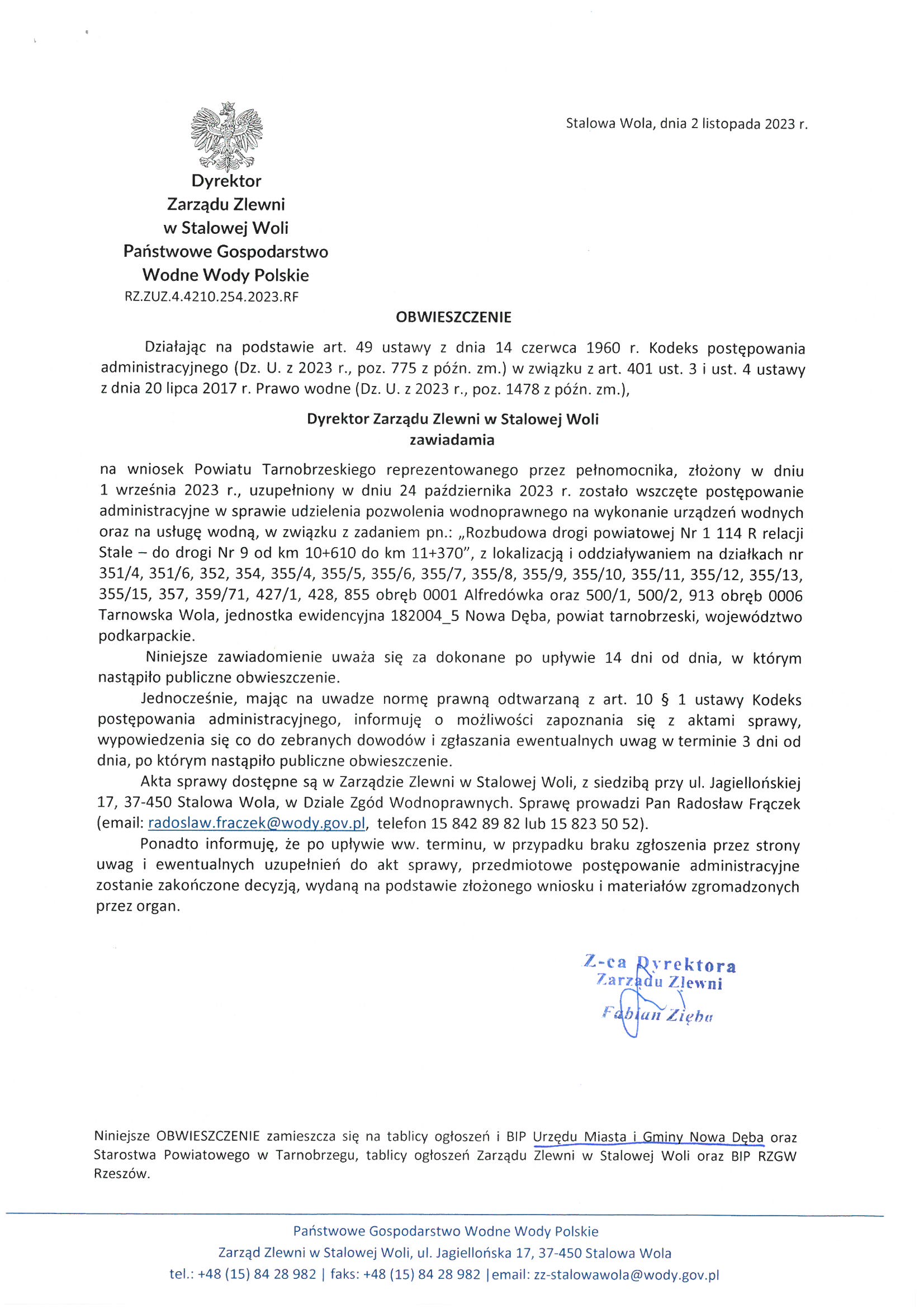 Obwieszczenie Dyrektora Zarządu Zlewni w Stalowej Woli