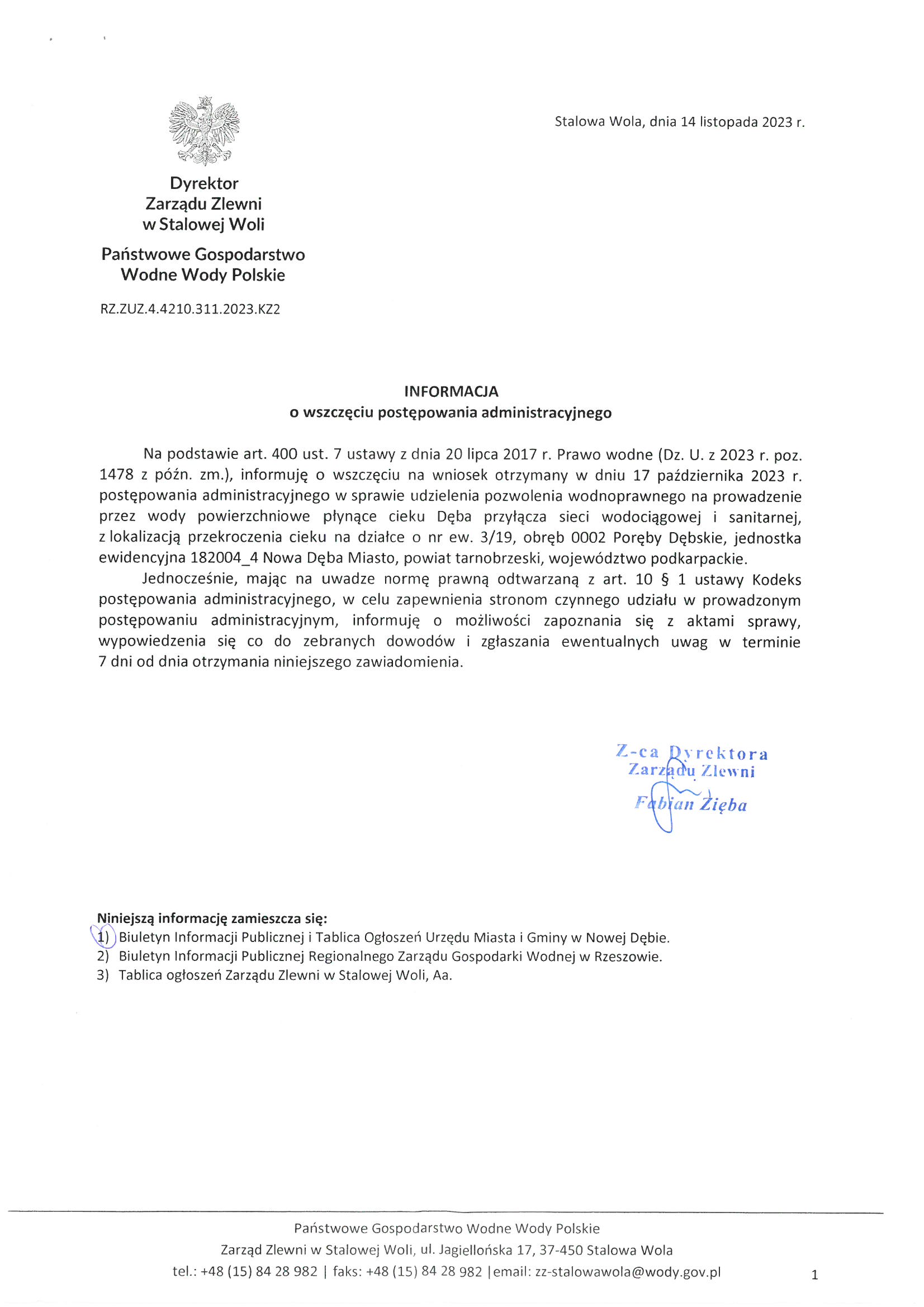 Informacja Dyrektora Zarządu Zlewni w Stalowej