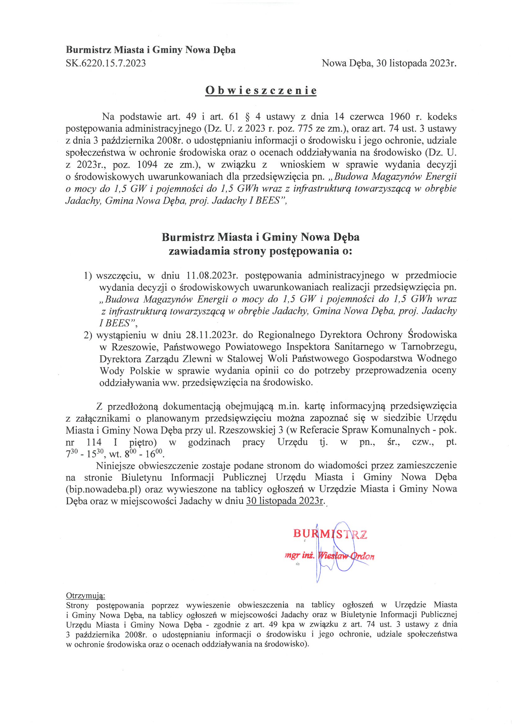 Obwieszczenie Burmistrza Miasta i Gminy Nowa Dęba z dnia 30 listopada 2023r. znak:SK.6220.15.7.2023