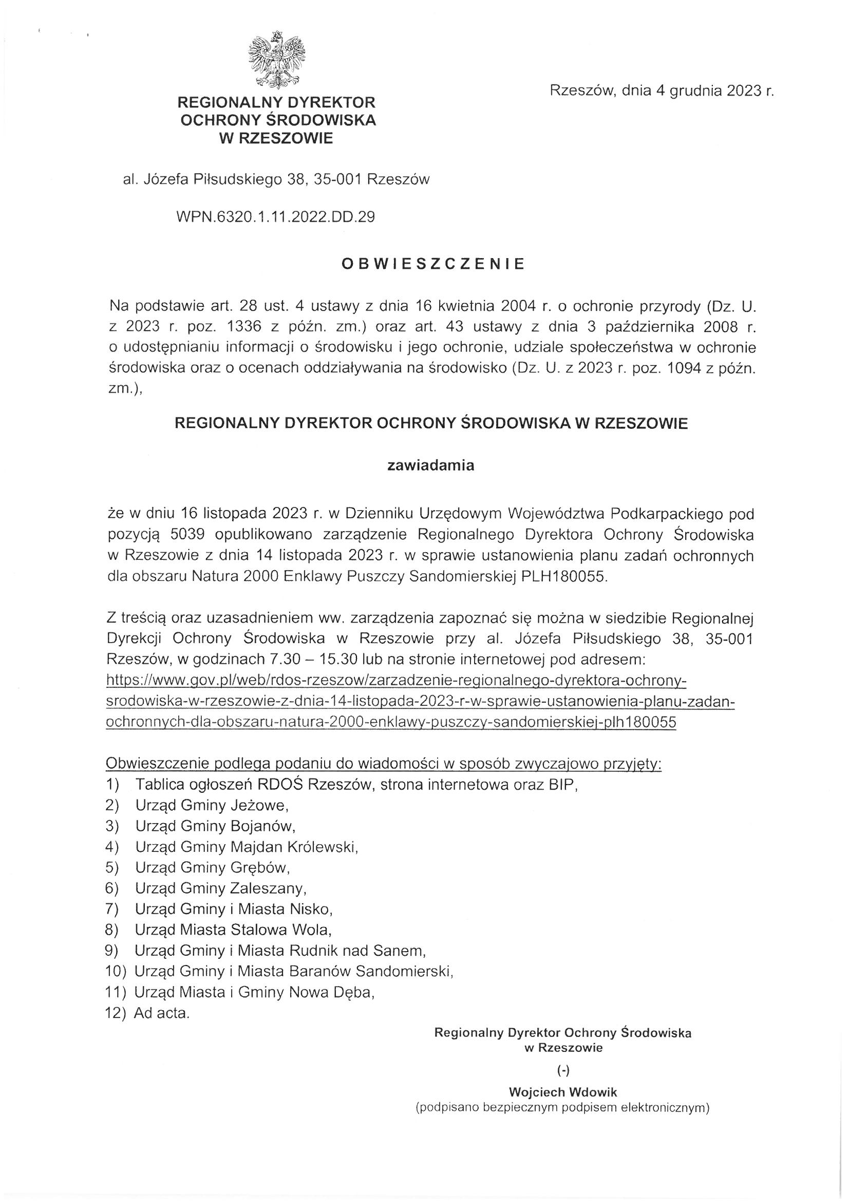 Obwieszczenie Regionalnego Dyrektora Ochrony Środowiska w Rzeszowie z dnia 04 grudnia 2023 r. znak:WPN.6320.1.11.2022.DD.29