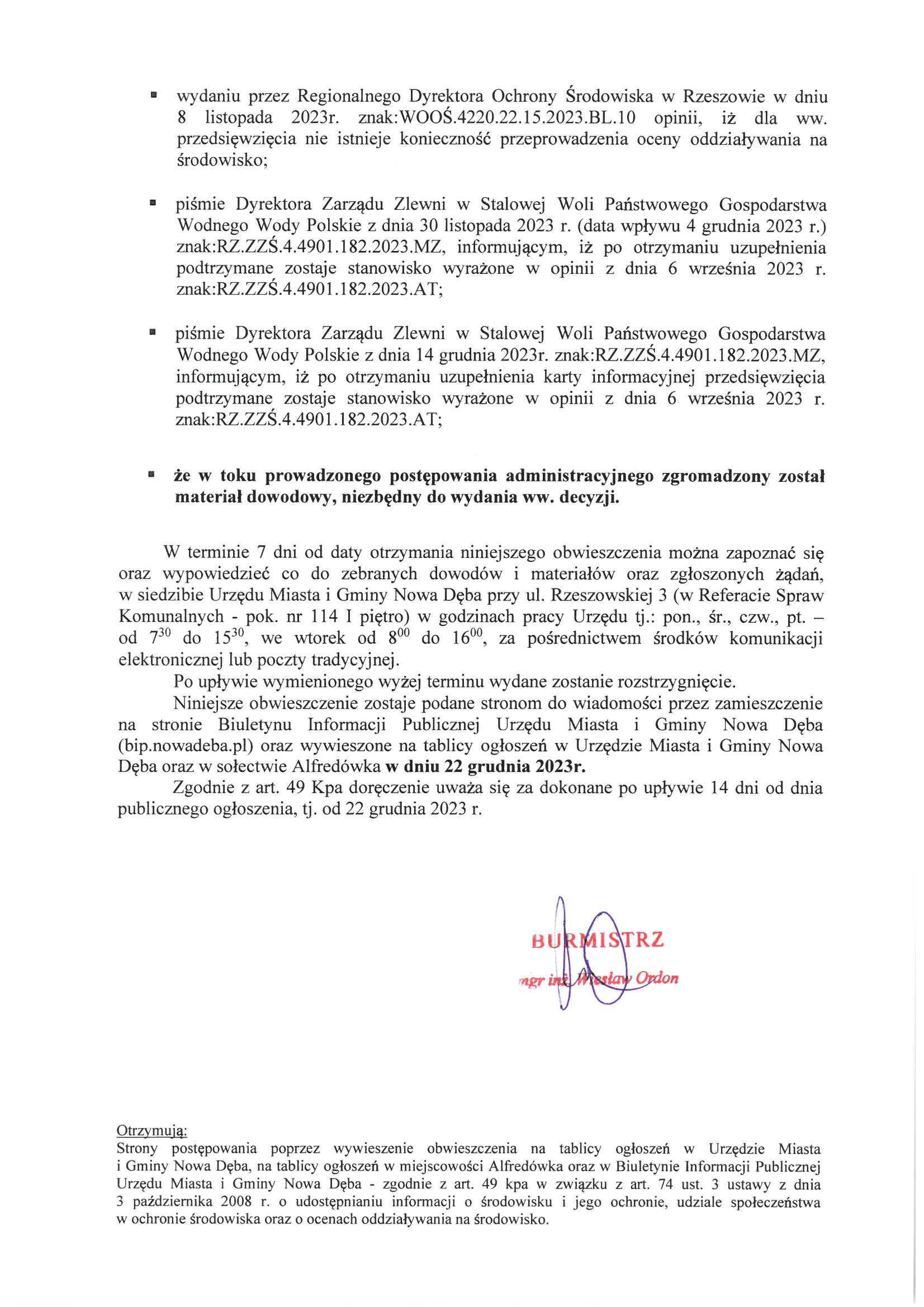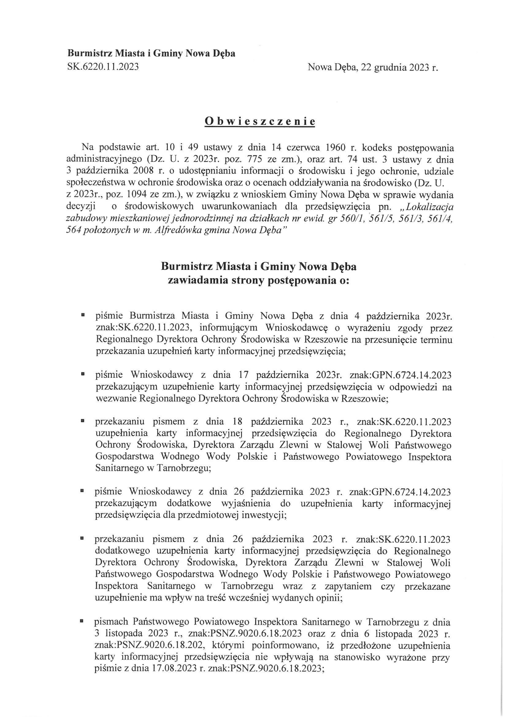 Obwieszczenie Burmistrza Miasta i Gminy Nowa Dęba z dnia 22 grudnia 2023 r.znak:SK.6220.11.2023