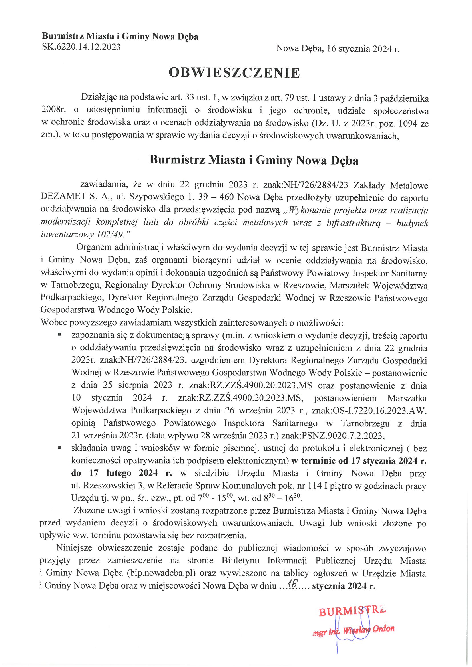 Obwieszczenie Burmistrza Miasta i Gminy Nowa Dęba z dnia 16 stycznia 2024 r. znak:SK.6220.14.12.2023
