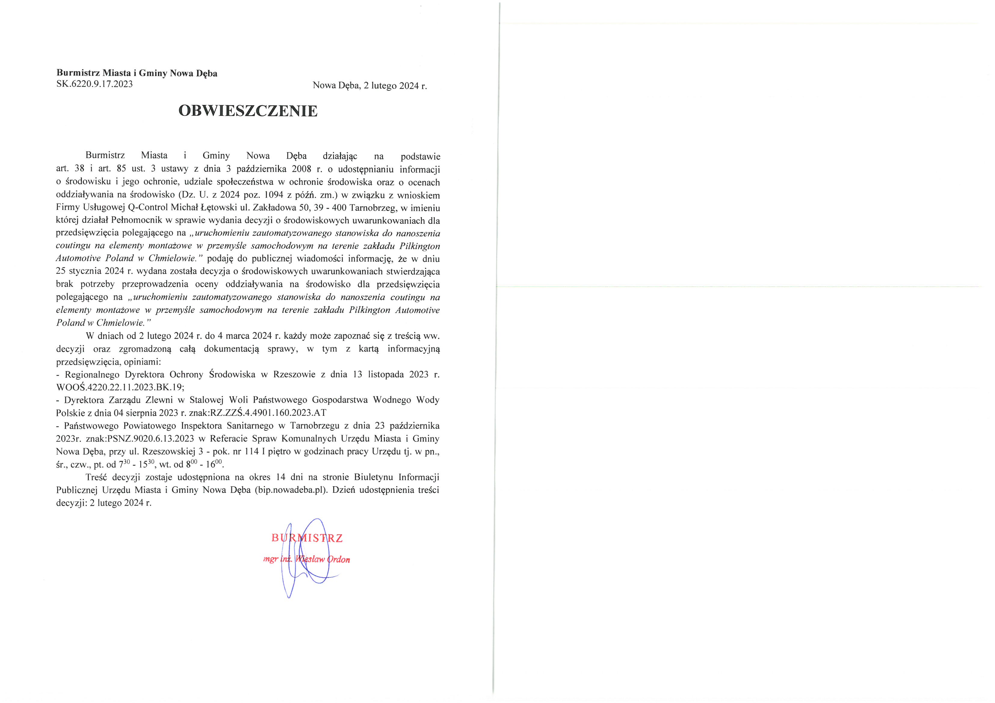 Obwieszczenie Burmistrza Miasta i Gminy Nowa Dęba z dnia 2 lutego 2024 r. znak:SK.6220.9.17.2023