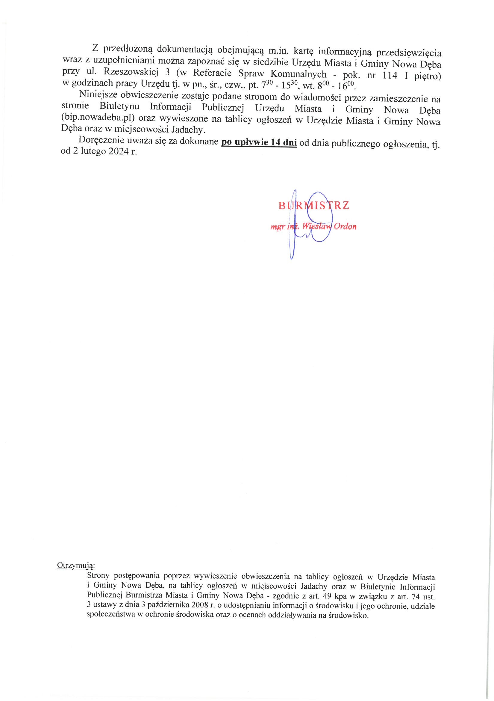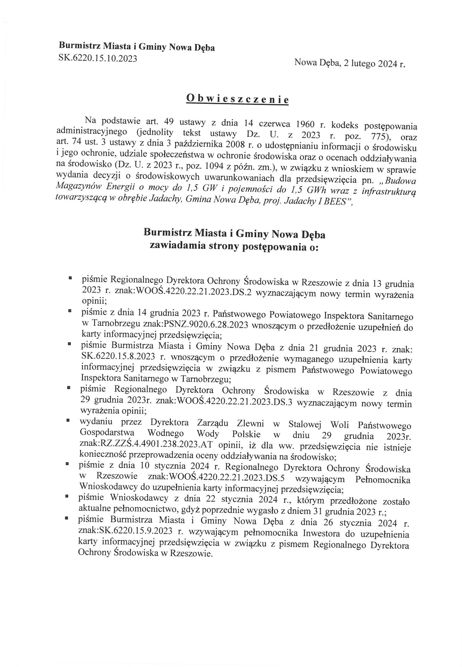 Obwieszczenie Burmistrza Miasta i Gminy Nowa Dęba z dnia 2 lutego 2024 r. znak:SK.6220.15.10.2023