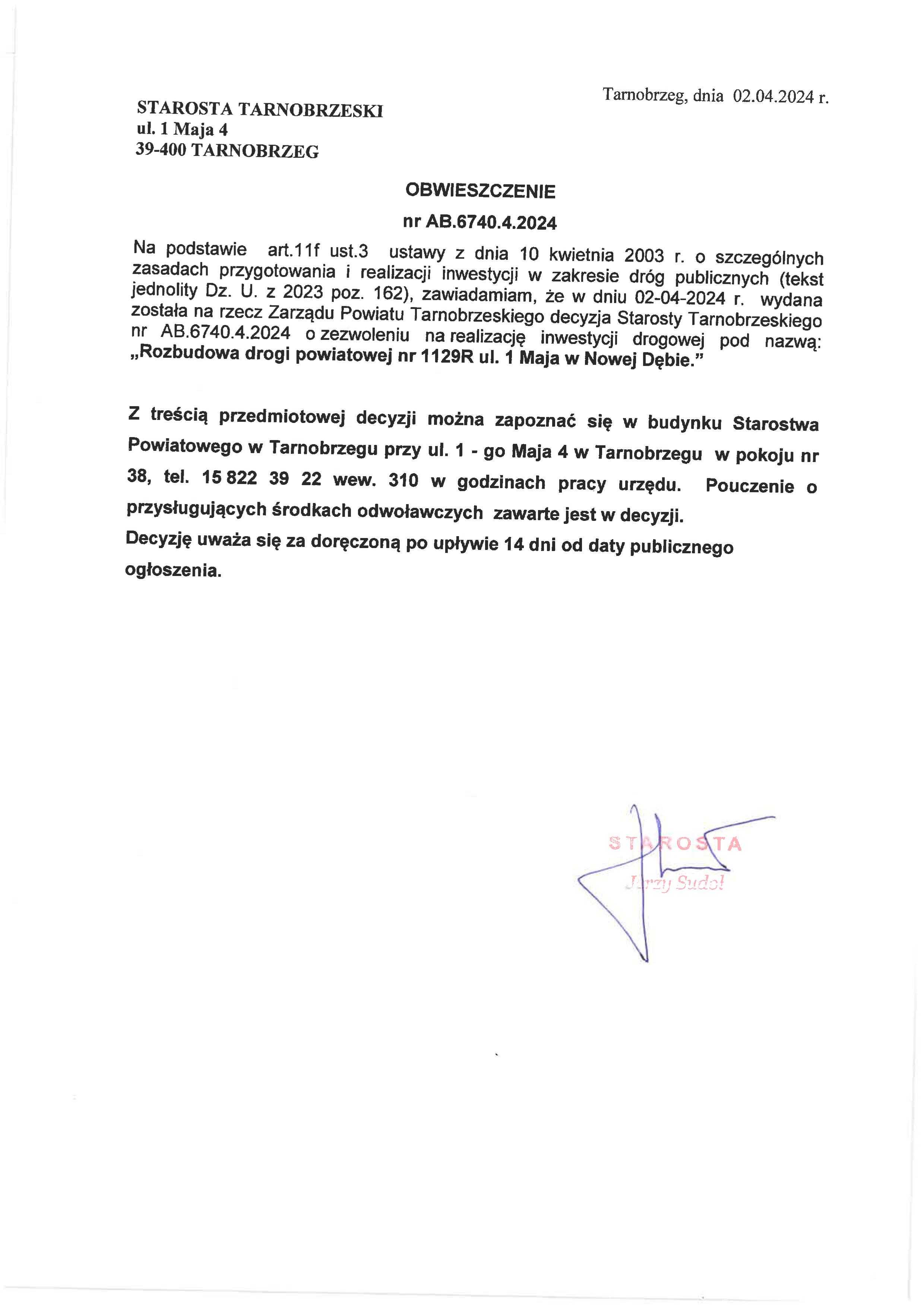Obwieszczenie Starosty Tarnobrzeskiego