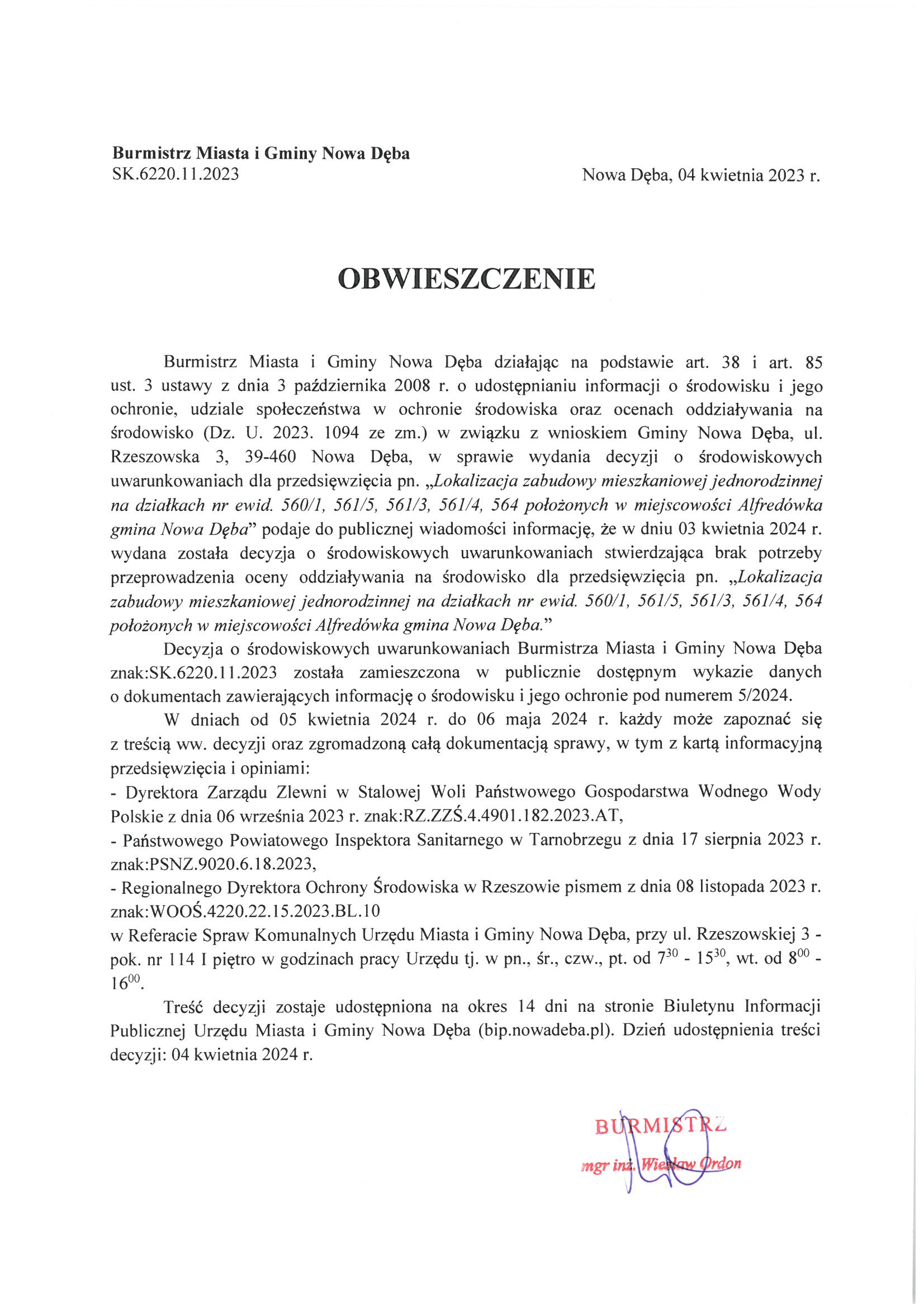 Obwieszczenie Burmistrza Miasta i Gminy Nowa Dęba z dnia 04 kwietnia 2024 r. znak:SK.6220.11.2023