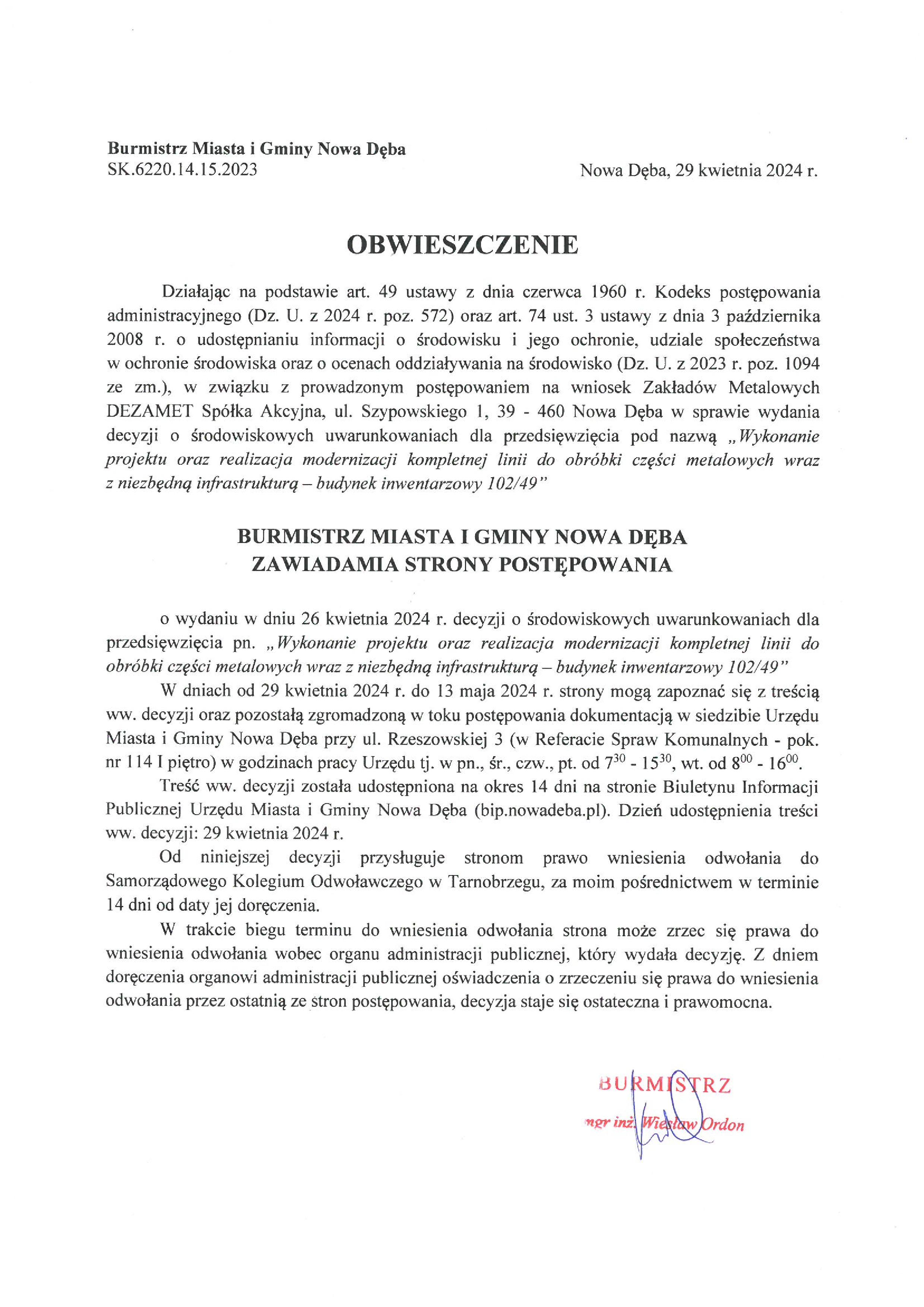Obwieszczenie Burmistrza Miasta i Gminy Nowa Dęba z dnia 29 kwietnia 2024 r. znak:SK.6220.14.15.2023