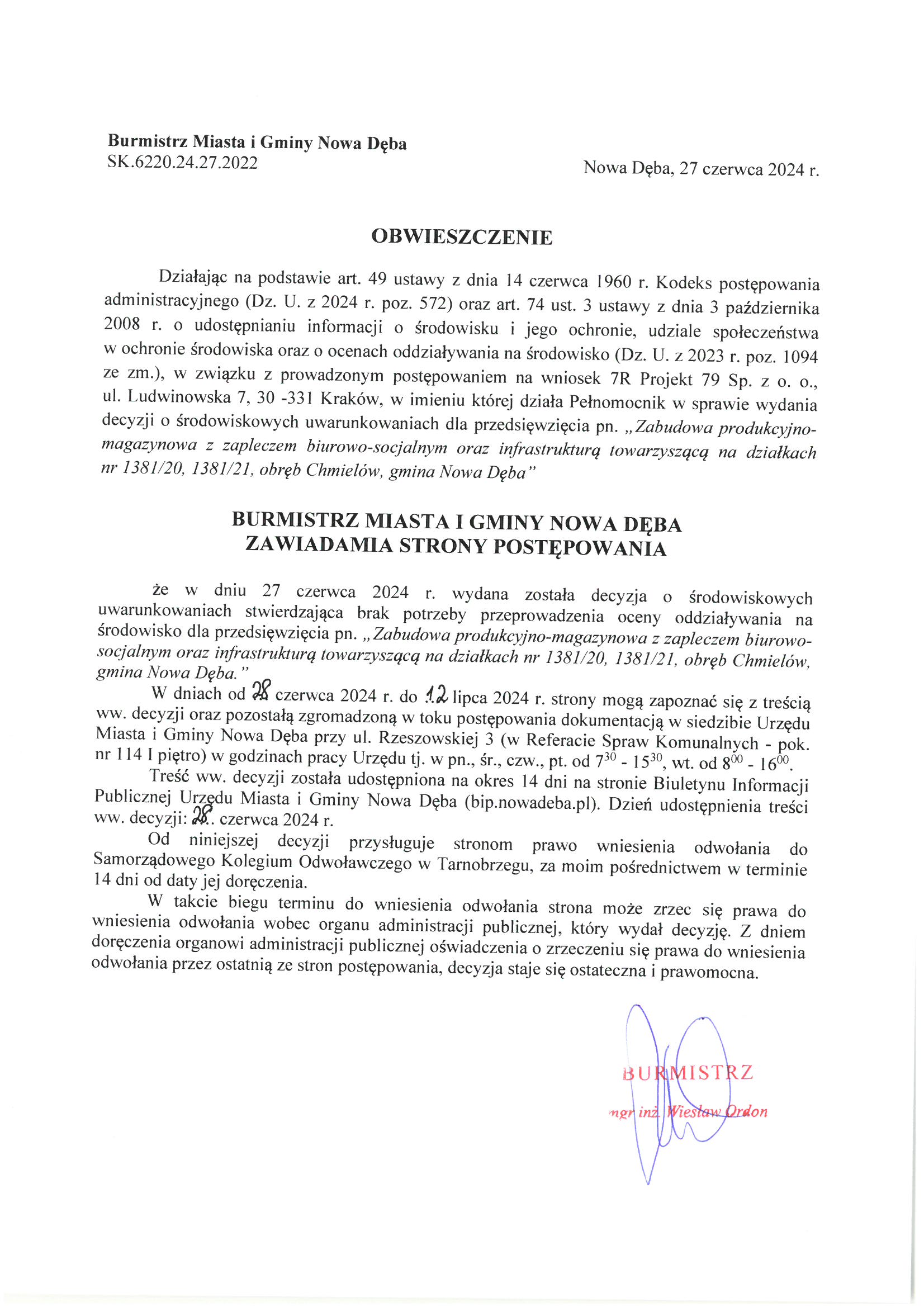 Obwieszczenie Burmistrza Miasta i Gminy Nowa Dęba znak:SK.6220.24.27.2022 z dnia 27 czerwca 2024 r.
