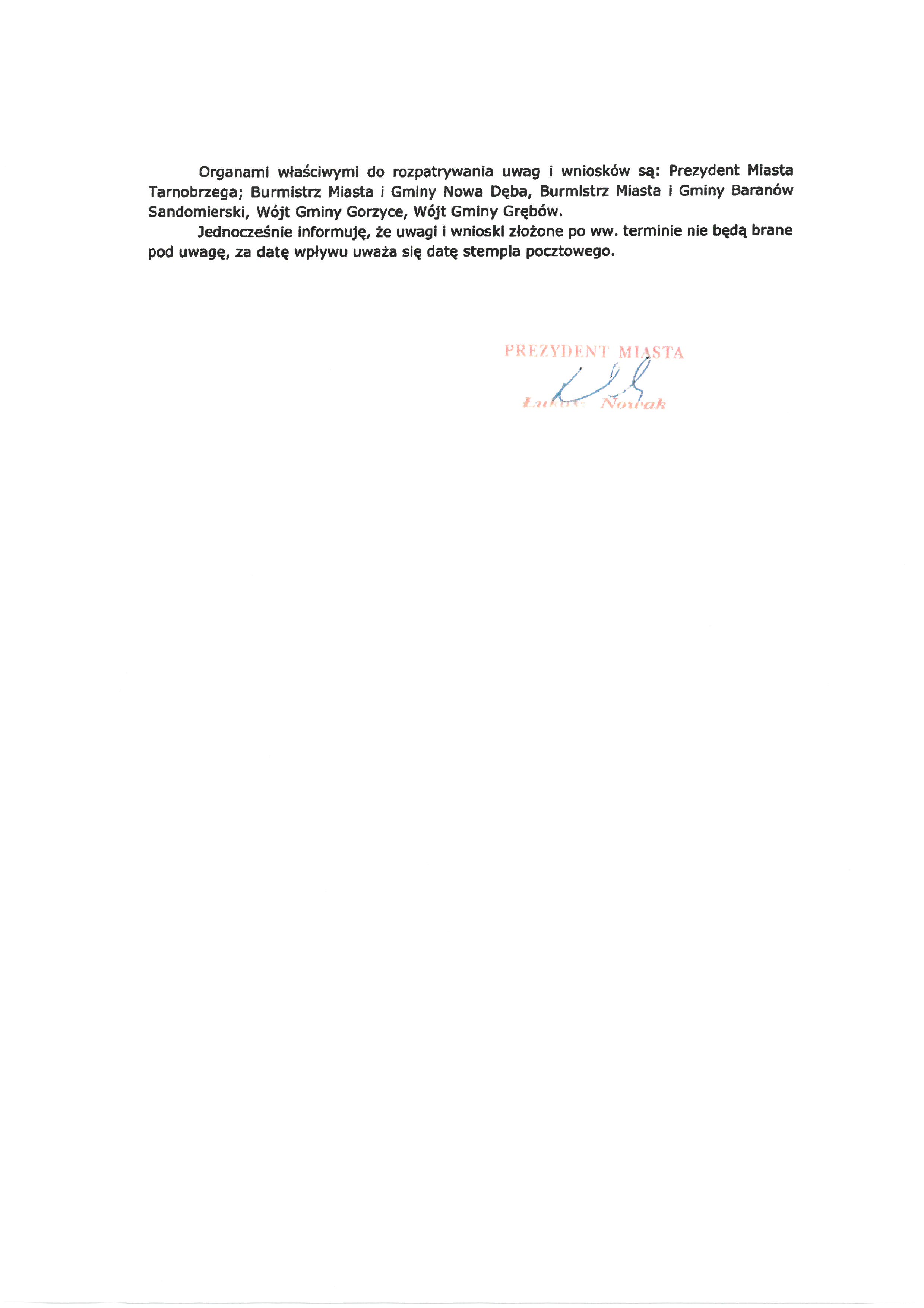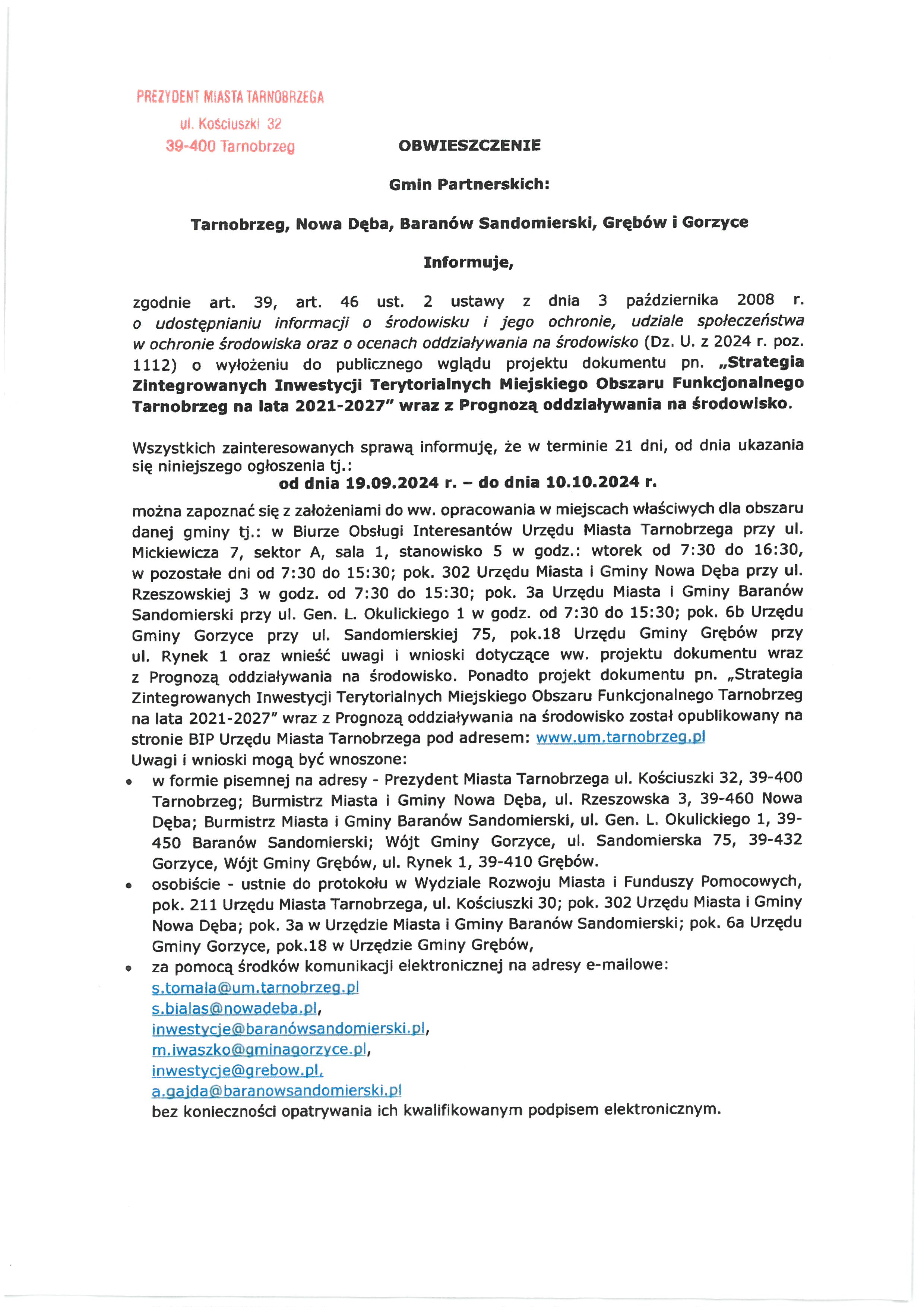 OBWIESZCZENIE Gmin Partnerskich: Tarnobrzeg, Nowa Dęba, Baranów Sandomierski, Grębów i Gorzyce