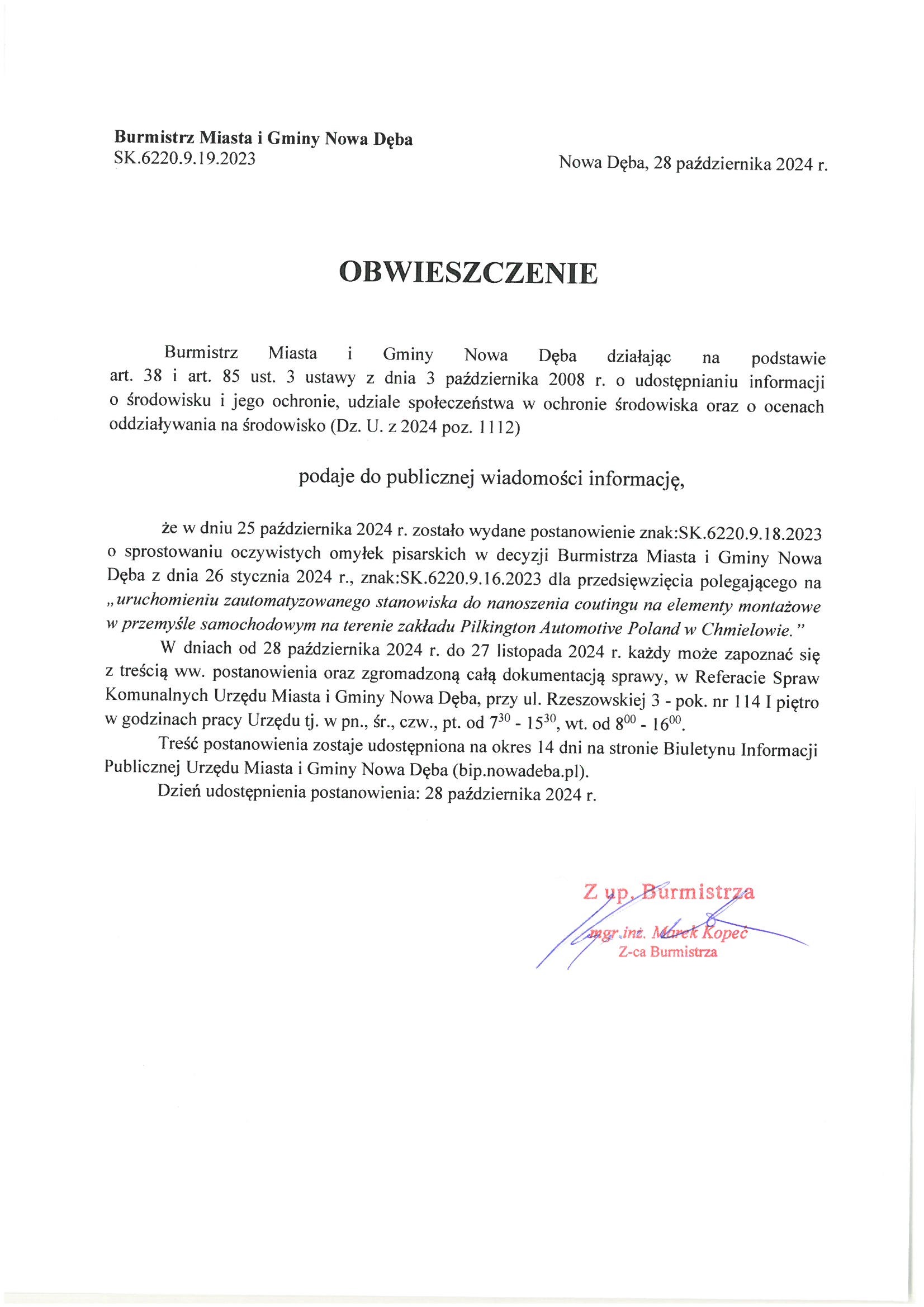 Obwieszczenie Burmistrza Miasta i Gminy Nowa Dęba z dnia 28 października 2024 r. znak:SK.6220.9.19.2023