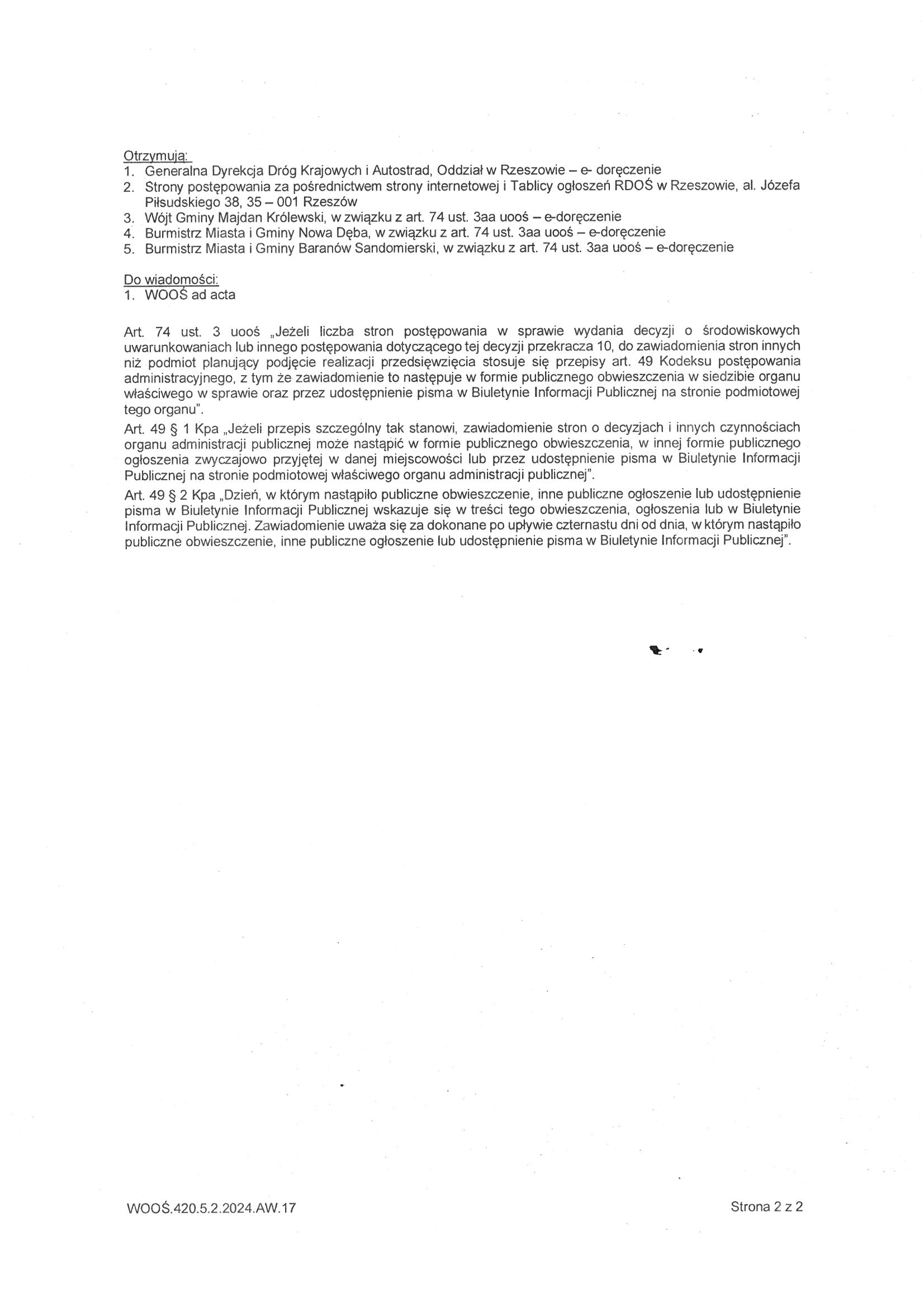 Obwieszczenie Regionalnego Dyrektora Ochrony Środowiska w Rzeszowie znak:WOOŚ.420.5.2.2024.AW.17
