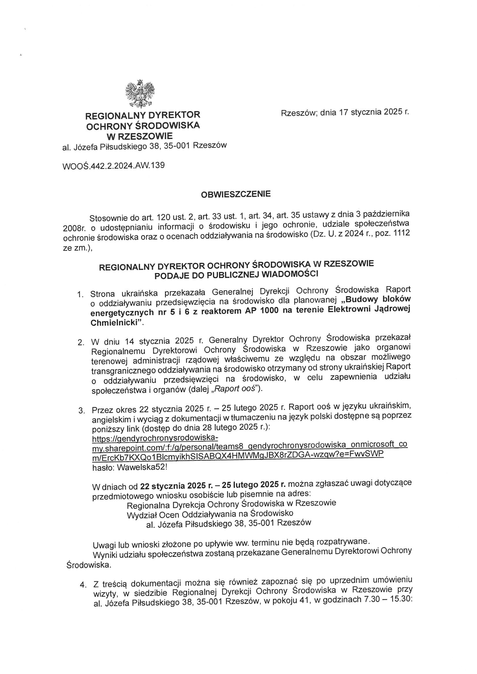 Obwieszczenie Regionalnego Dyrektora Ochrony Środowiska w Rzeszowie znak:WOOŚ.442.2.2024.AW.140
