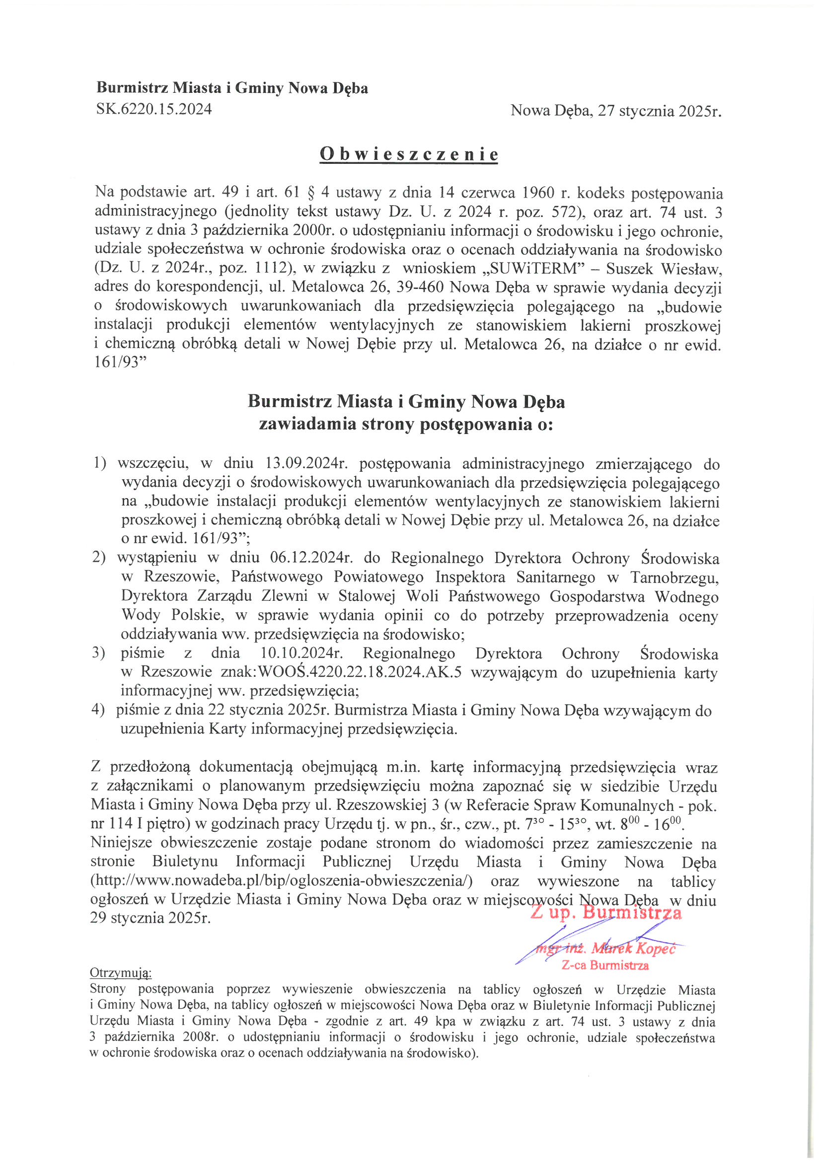 Obwieszczenie Burmistrza Miasta i Gminy Nowa Dęba z dnia 27 stycznia 2025 r. znak:SK.6220.15.2024