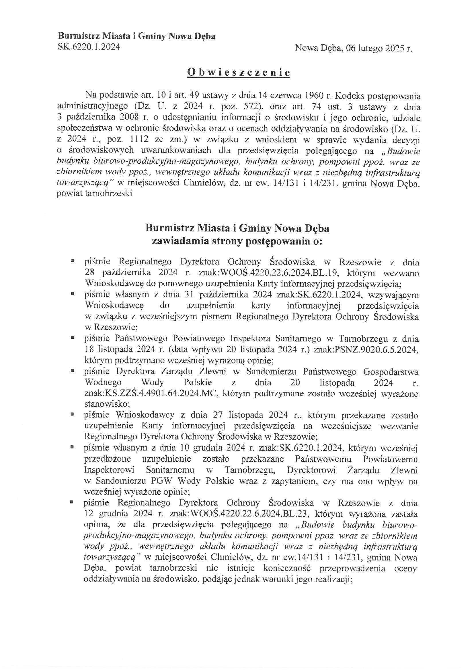 Obwieszczenie Burmistrza Miasta i Gminy Nowa Dęba z dnia 06 lutego 2025 r. znak:SK.6220.1.2024