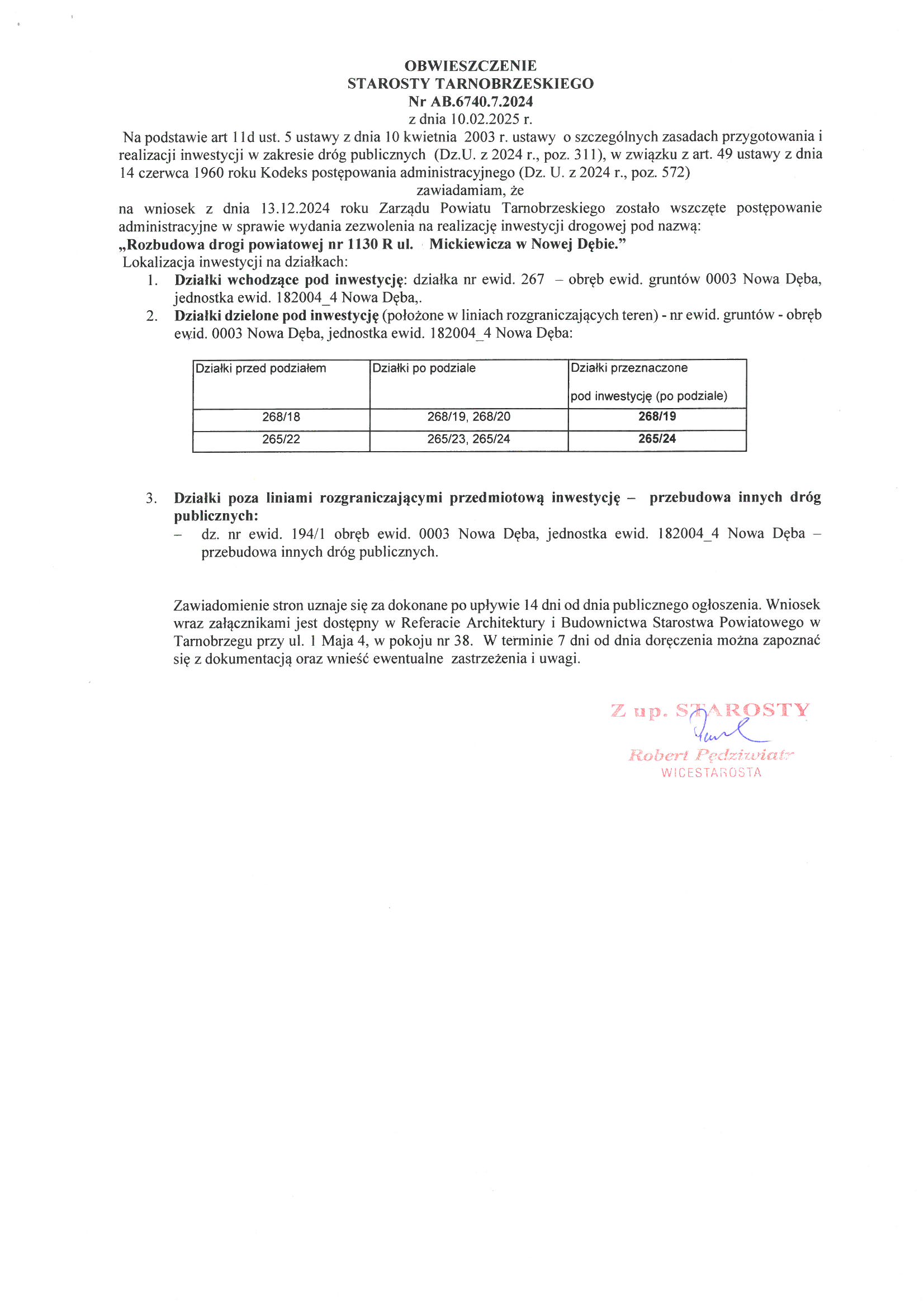 Obwieszczenie Starosty Tarnobrzeskiego Nr AB.6740.7.2024