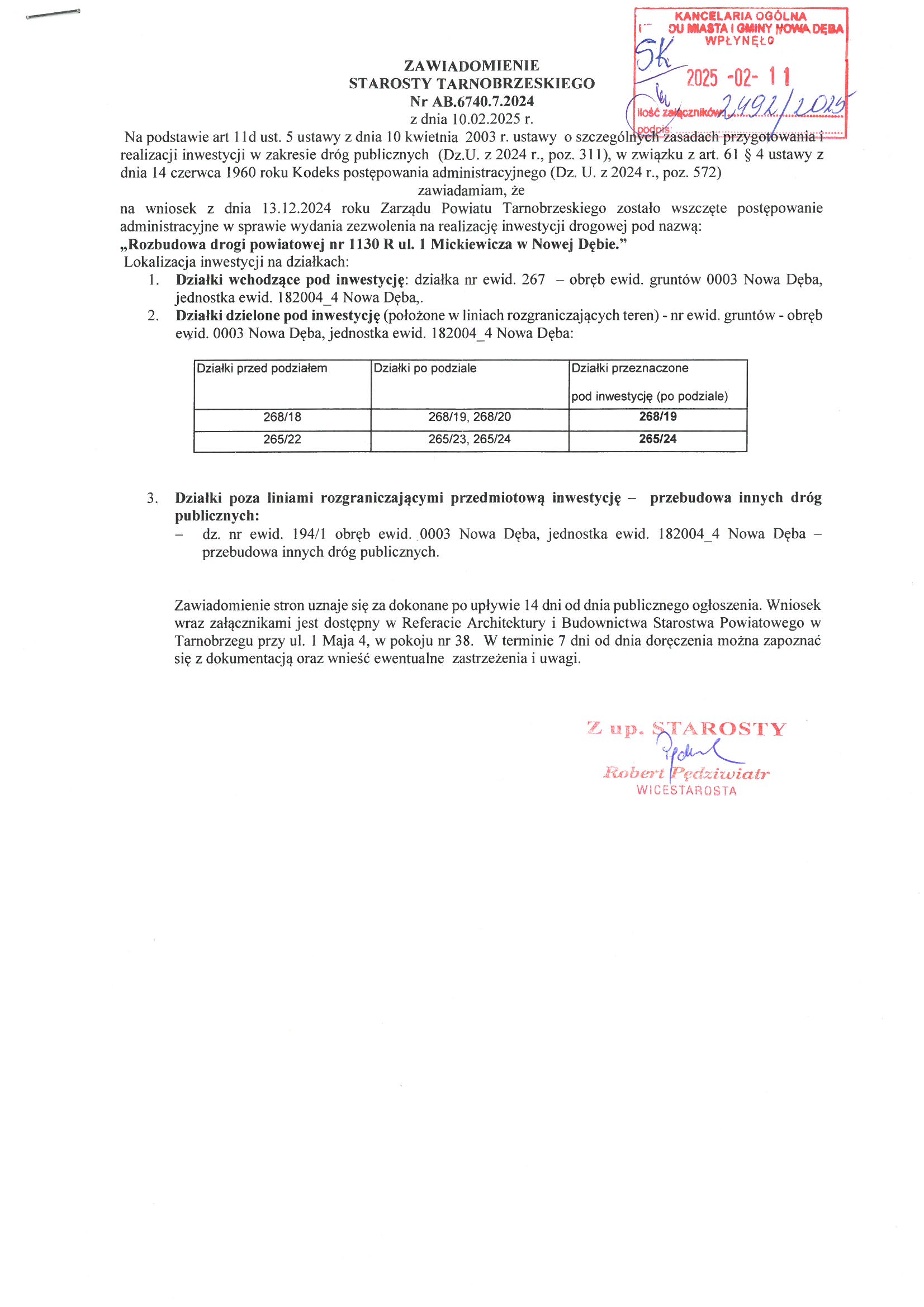 Zawiadomienie Starosty Tarnobrzeskiego Nr AB.6740.7.2024