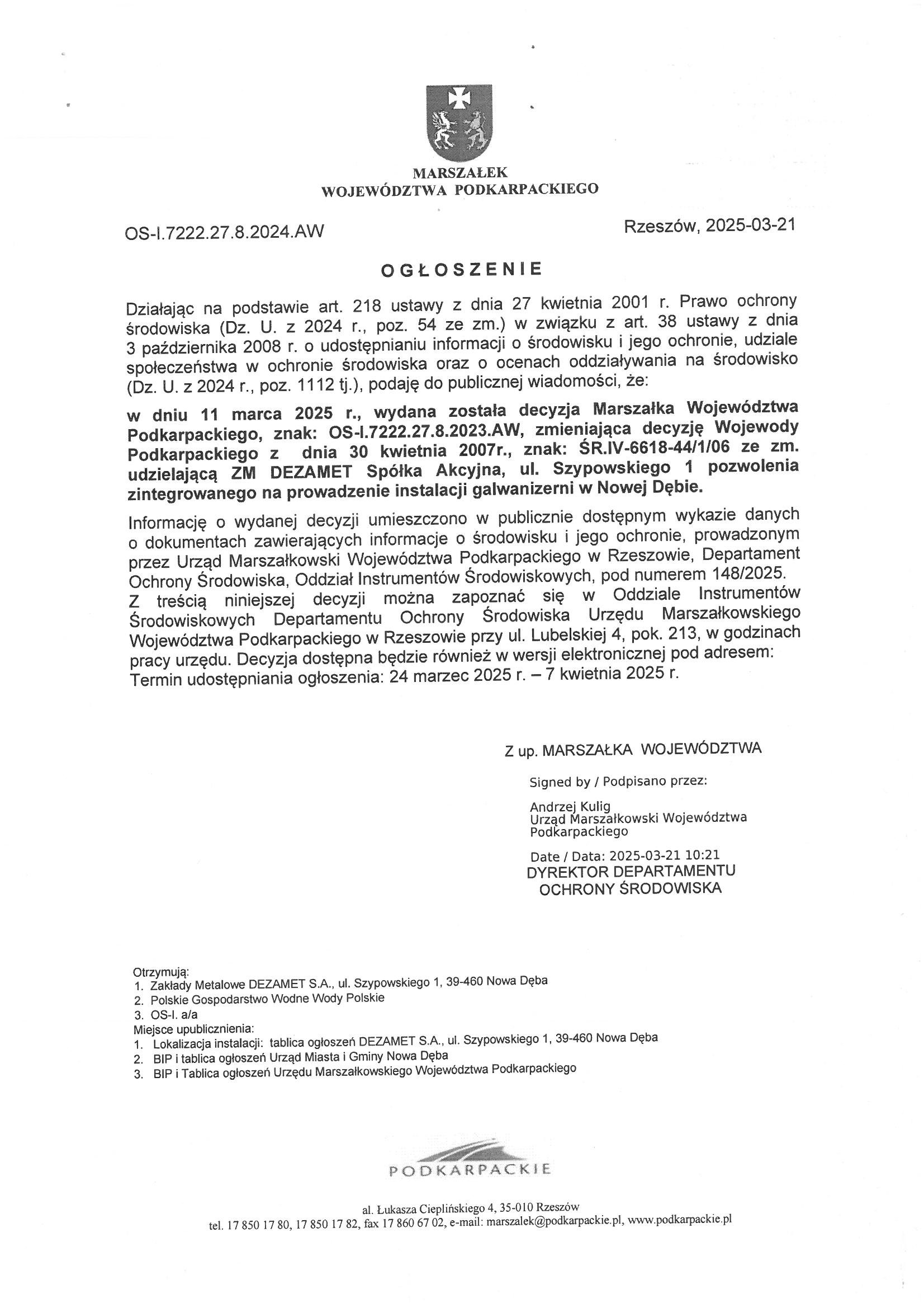 Ogłoszenie Marszałka Województwa Podkarpackiego z dnia 21 marca 2025 r. znak: OS-I.7222.27.8.2024.AW