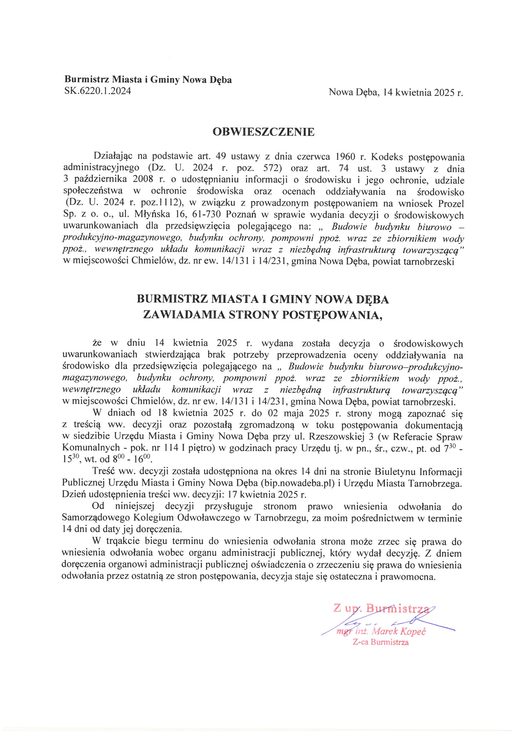 Obwieszczenie Burmistrza Miasta i Gminy Nowa Dęba znak:SK.6220.1.2024 z dnia 14 kwietnia 2025 r.