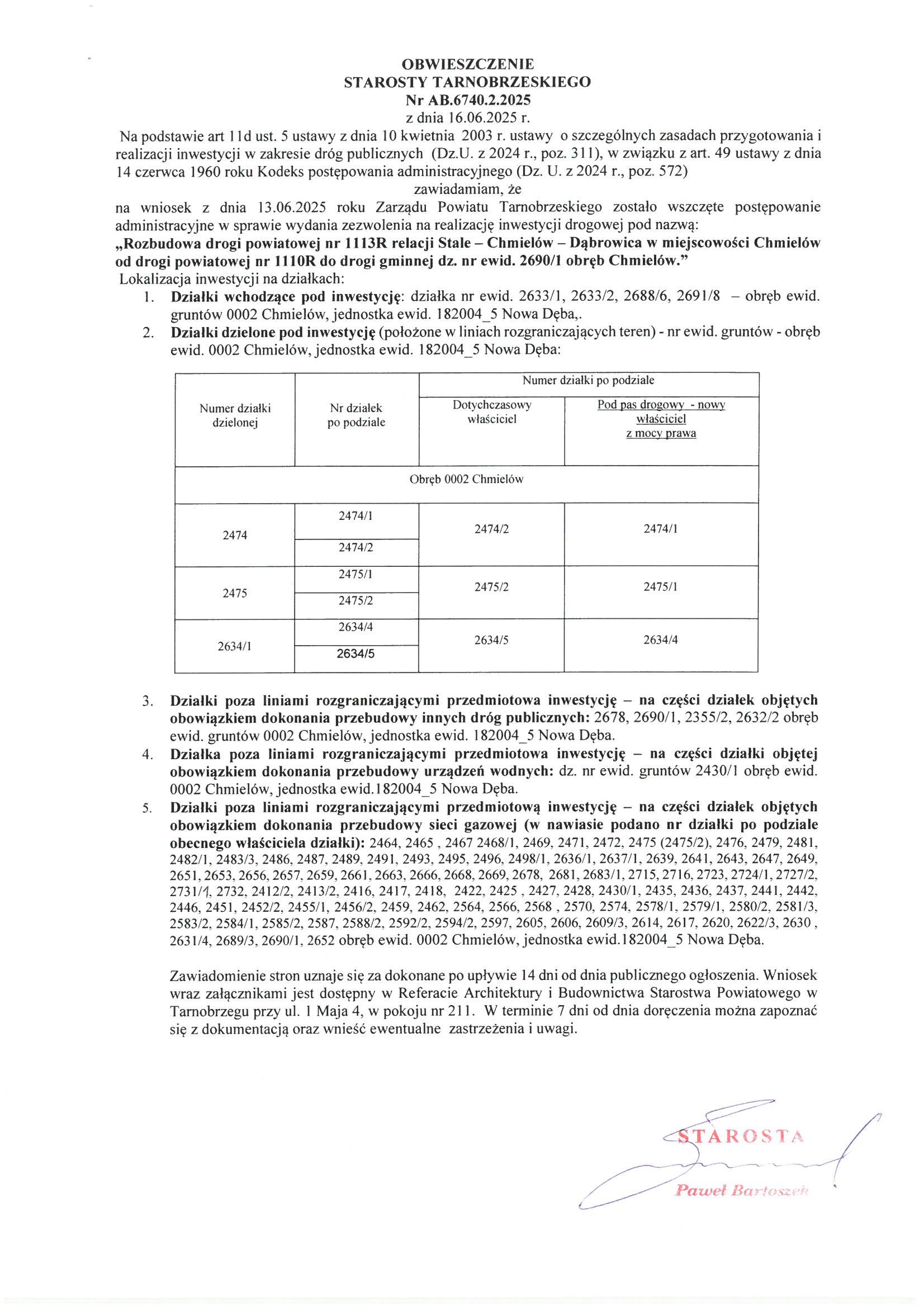 Obwieszczenie Starosty Tarnobrzeskiego Nr AB.6740.2.2025