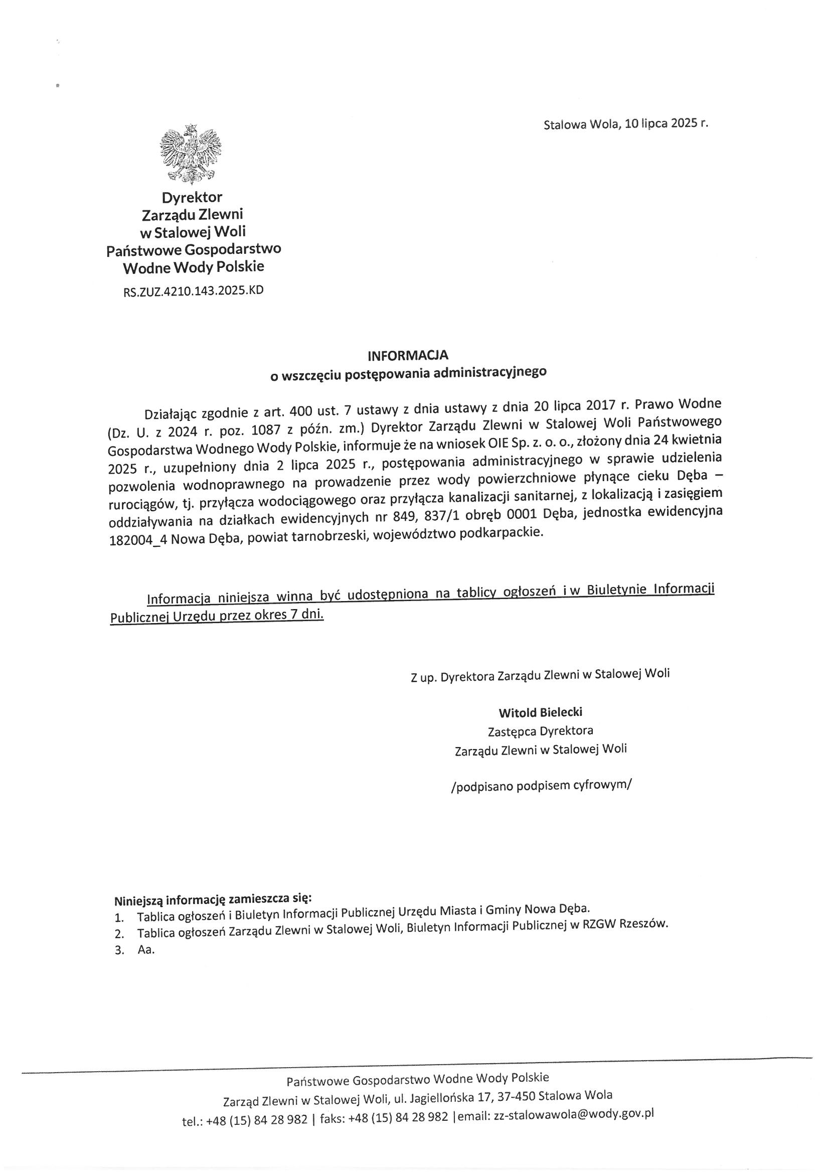 Informacja Dyrektora Zarządu Zlewni w Stalowej Woli