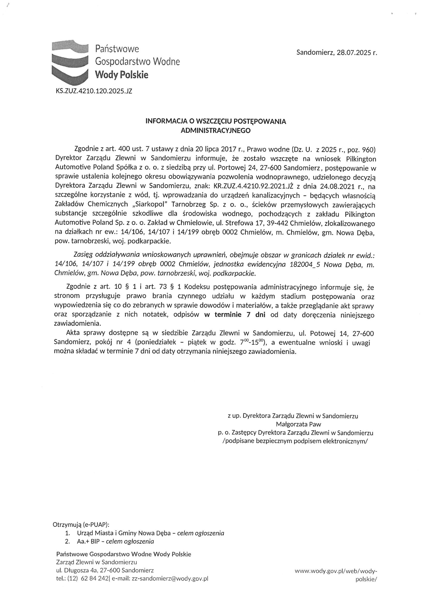 Informacja Dyrektora Zarządu Zlewni w Sandomierzu