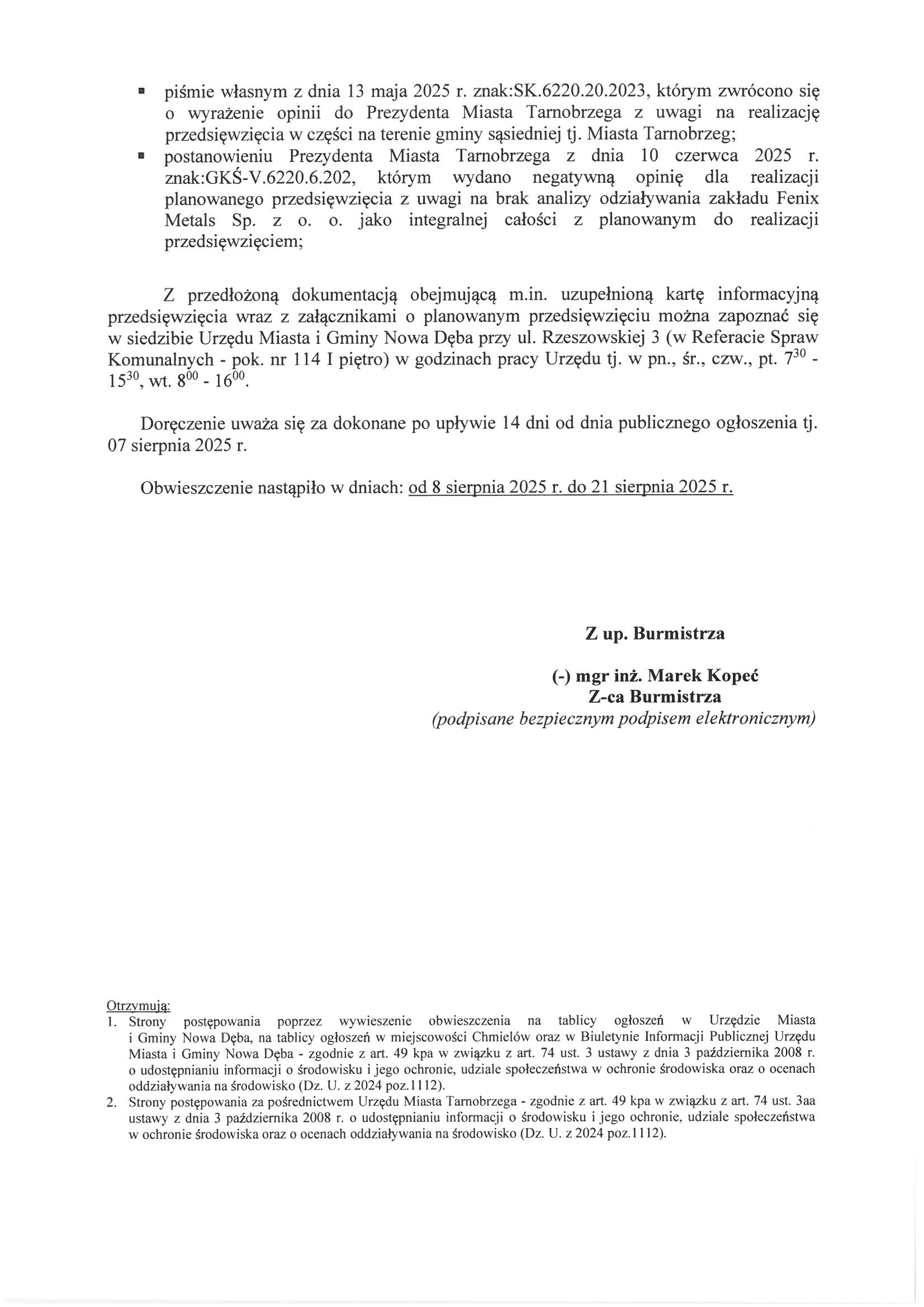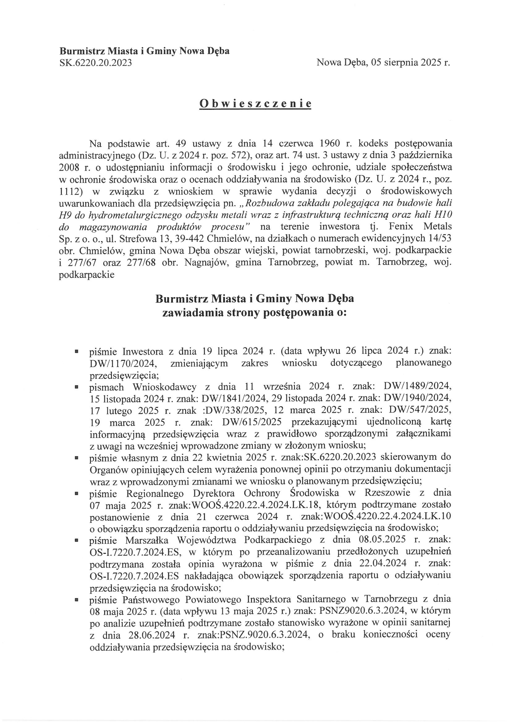 Obwieszczenie Burmistrza Miasta i Gminy Nowa Dęba z dnia 05 sierpnia 2025 r. znak:SK.6220.20.2023